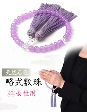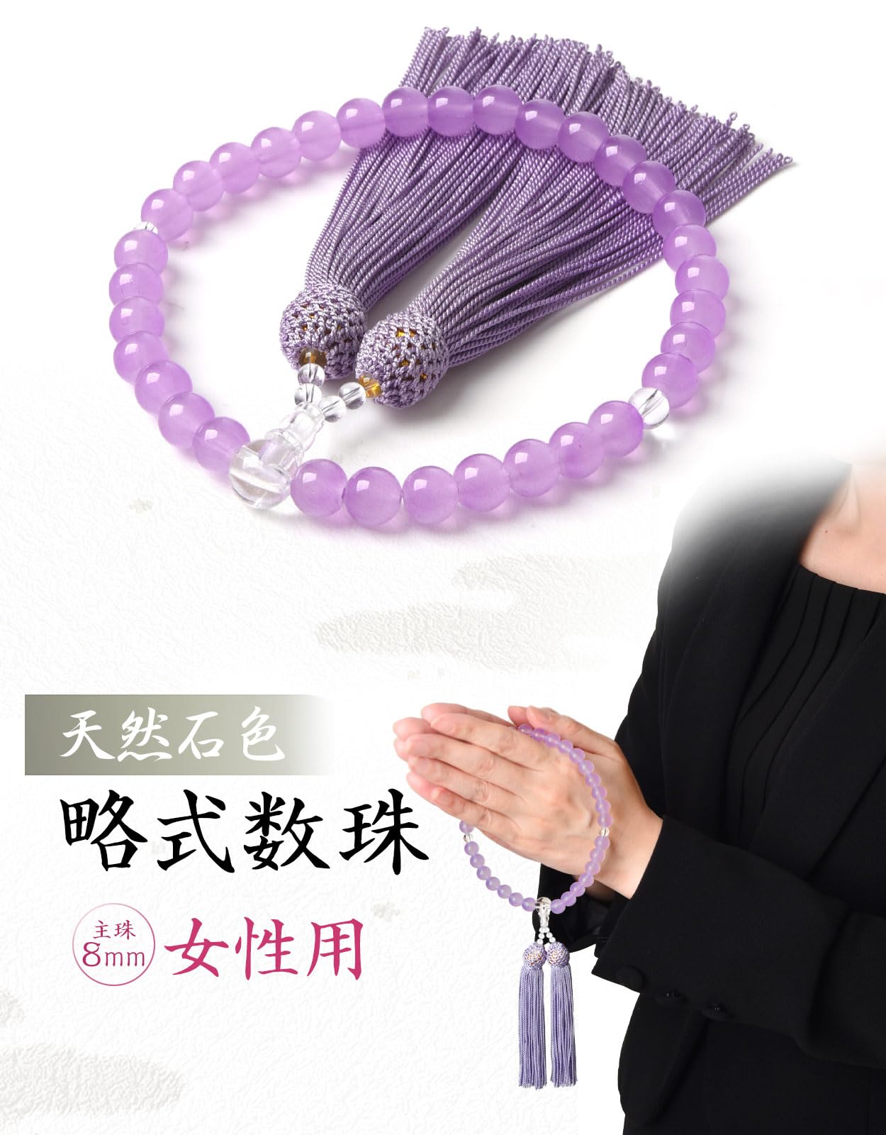 (送料込)【EsuonHappiness】数珠 女性用 8mm 頭房 硝子 略式数珠 すべての宗派で使える 選べるお色 法事 葬儀 数珠袋付き 天然石色 人絹房 (藤雲石色)