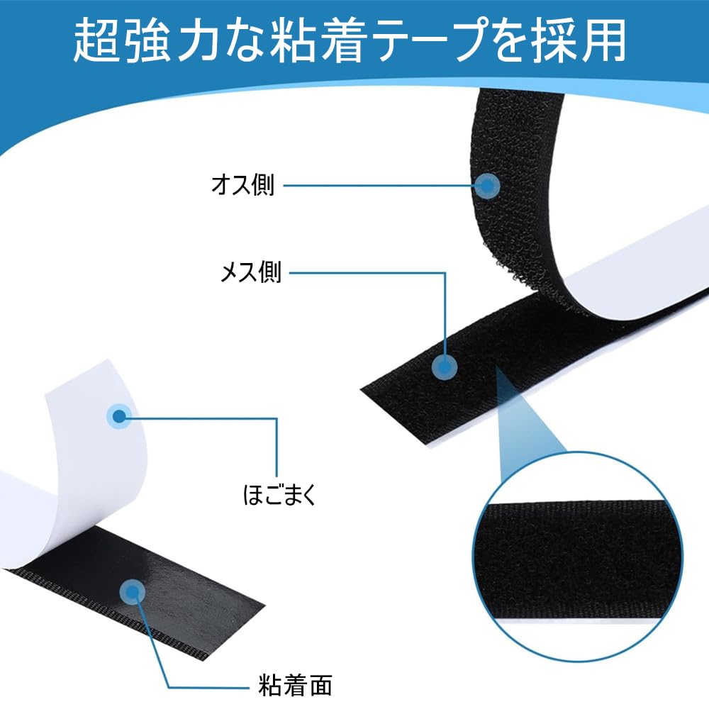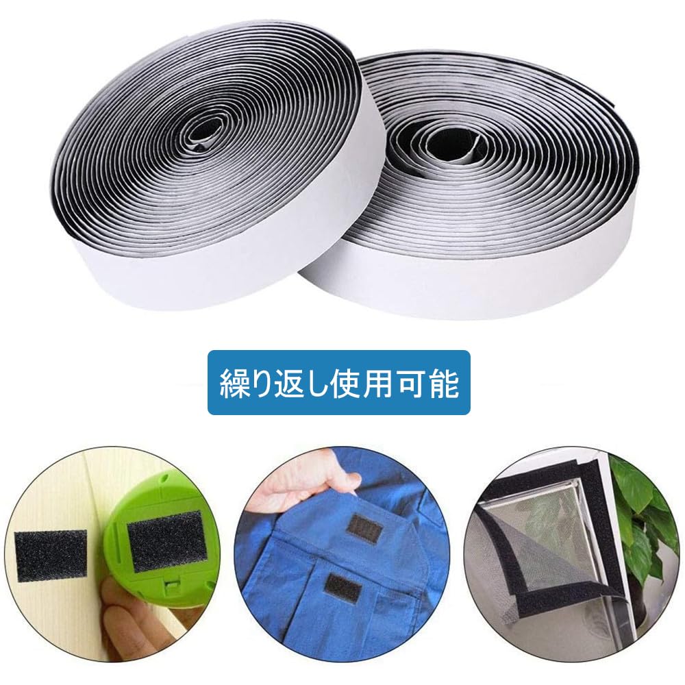 強力マジック付きテープ 2本セット オスメスセット 各2cm×5m マジックテープ 両面テープ付き 耐熱 防水 繰り返し利用可能 DIY用 業務用 家庭用 工業用 (ブラック)