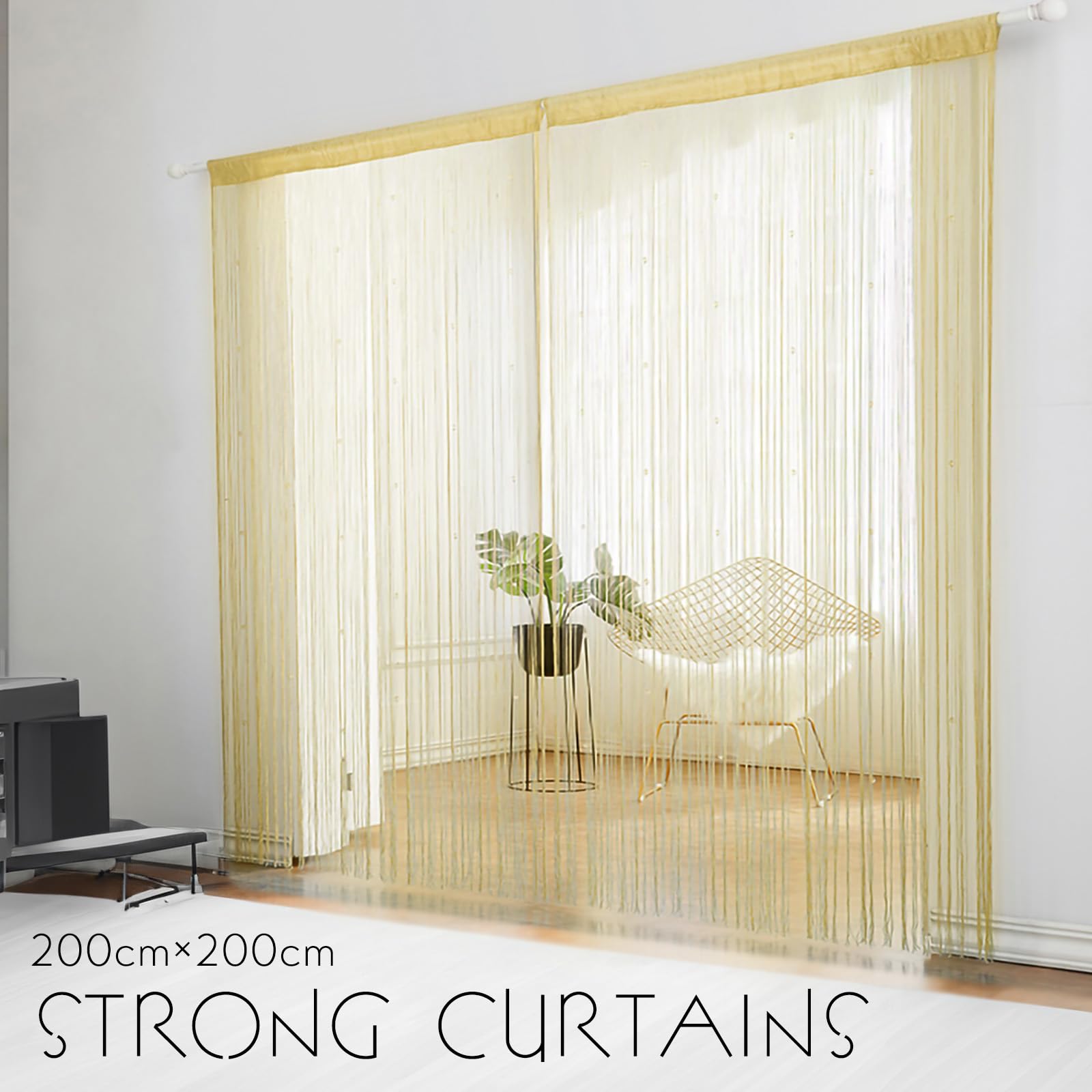 ストリングカーテンは、風通しの良い場所での目隠しに最適で、風に煽られることもありません。このひものれん 170は、お部屋の印象を簡単に変えられるだけでなく、間接照明と組み合わせることで美しい光の演出にも活用できます。