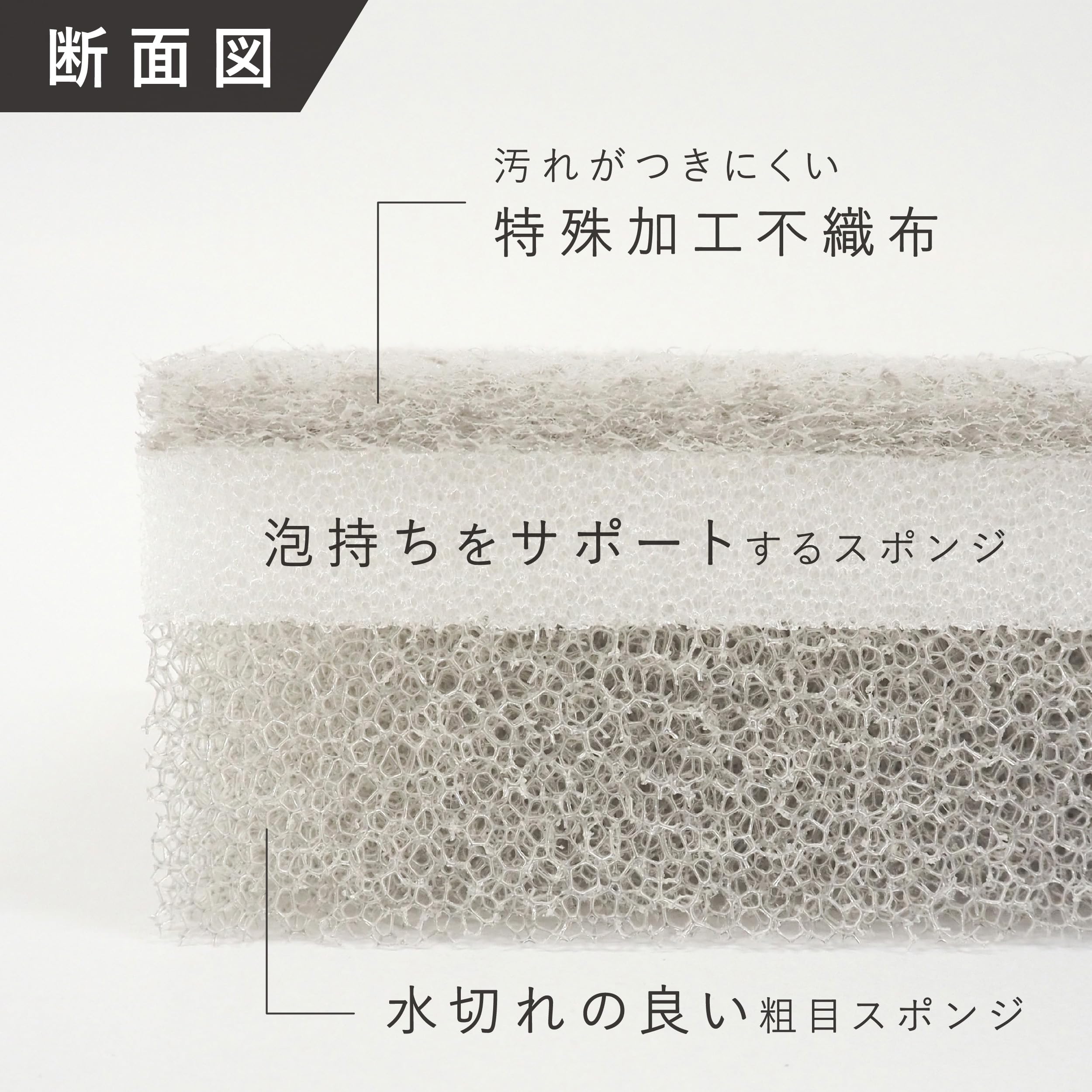 特殊加工の不織布で、汚れが付きにくく、キレイが長持ちする スポンジです ※特殊加工は不織布のみに施されています