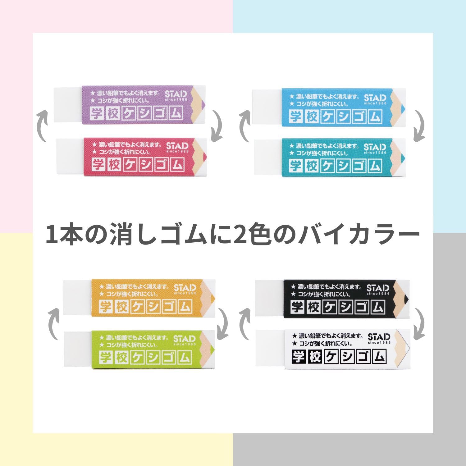 【特徴3】一本の消しゴムに2色のバイカラー!選べる8色カラーバリエーション
