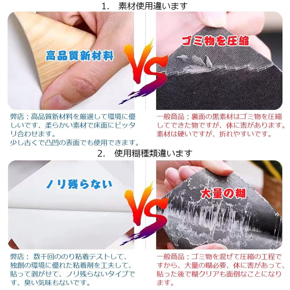 【のり残らない】のりでも自社特別技術で生産しております、数百回以上のテストリメイクを試験して、剥がしてのり残らなくて傷つけることなく、適切な強度のりを選び抜きました。回復可能です、賃貸最適。【ボロ床隠し】ザラザラの旧床、少し凸凹のフロアタイルの上にも貼れますが柔らかいPVC新素材から、カッターで寸法通りに切断しやすくて角の所でもキレイ貼れます。