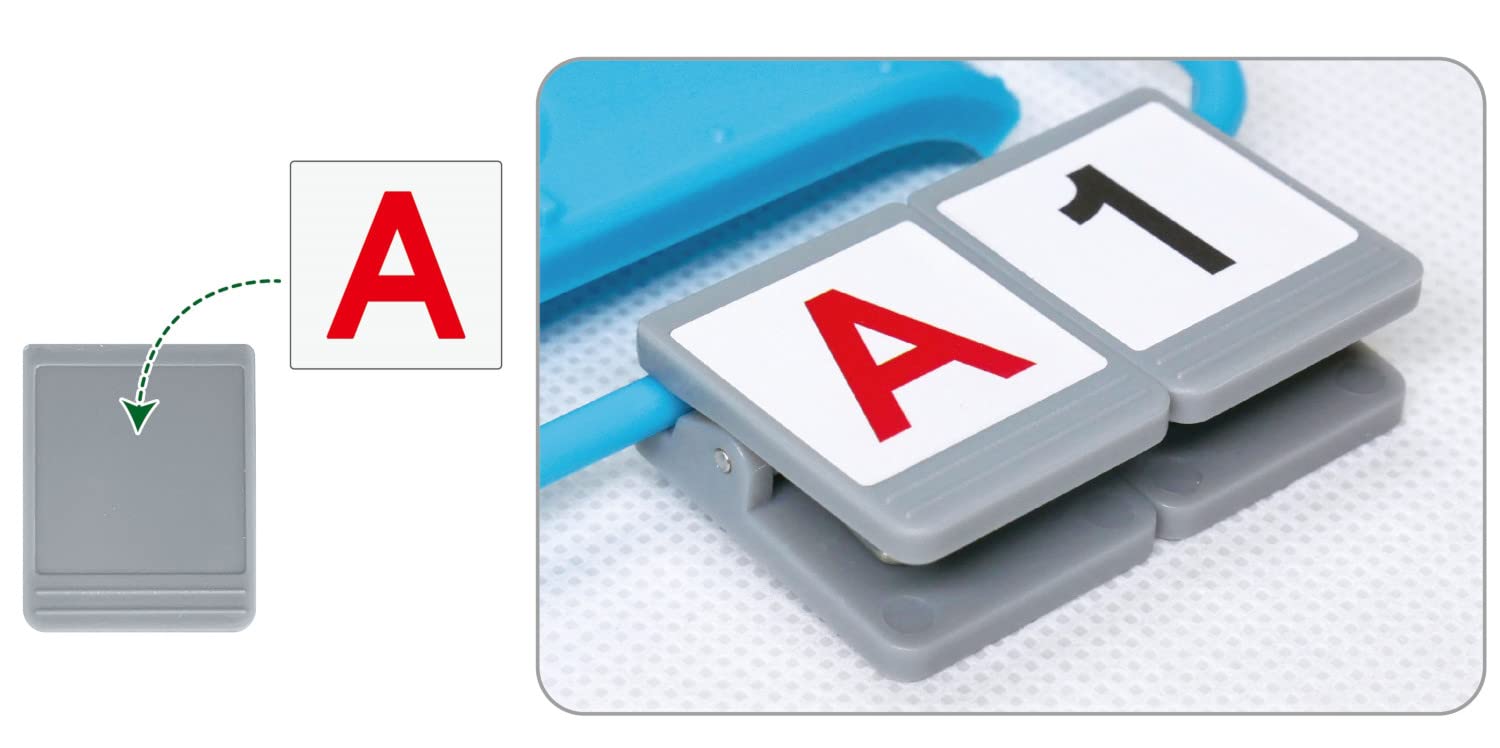 付属の記号シールをクリップに貼り付けて、ランナー枠に取り付ければ、ランナーの”記号タグ”に変身。タグのサイズは最適に設計しており、ふらつくことなくランナー枠に固定ができます。