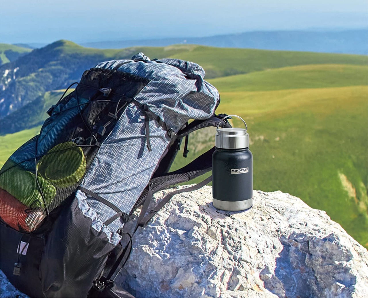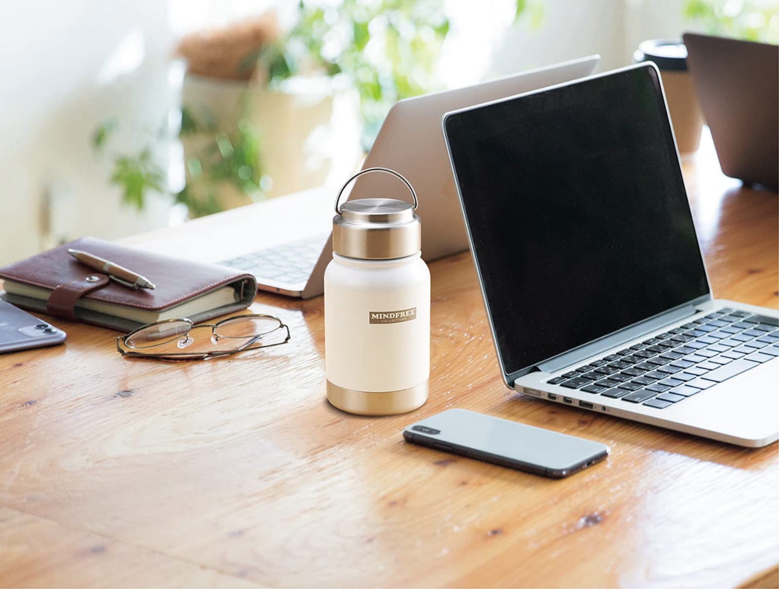 【MINDFREE COLLECTIONS】ステンレスミニボトル <商品特徴> ●ボディはキズつきにくい粉体塗装(パウダーコーティング) ●アウトドアにもインドアにも最適です。 ●折りたたみハンドル付きで持ち運びも便利。カラビナを付けたりフックに吊り下げたり用途色々。 ●大きな氷もラクラク入る広口(4.7cm) ●保温性能 95℃→54℃(6時間後) ※室温20℃±2℃において、製品の中せん下端まで熱湯を満たし、湯温が95℃±1℃の時から6時間放置した後の内容湯の温度。 ●保冷効力 11度以下6時間 <商品仕様> 【素材】 本体:外瓶/18-8ステンレス(粉体塗装) 内瓶/18-8ステンレス フタ栓:ポリプロピレン、ステンレス鋼 ハンドル:ステンレス鋼パッキン:シリコーン【容量】実容量(約)350ml 【サイズ】底径7.5cm×高さ14.4cm 【重量】235g 【生産国】中国