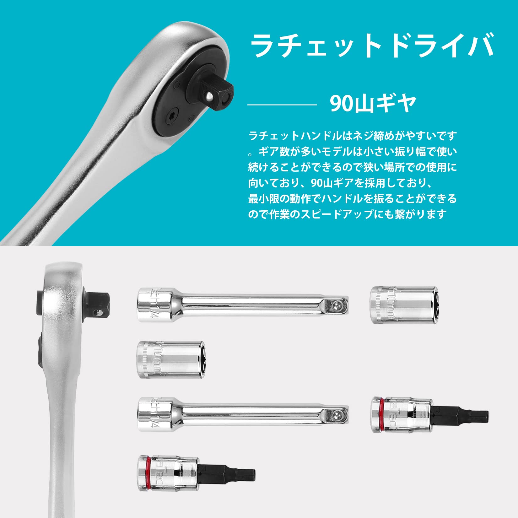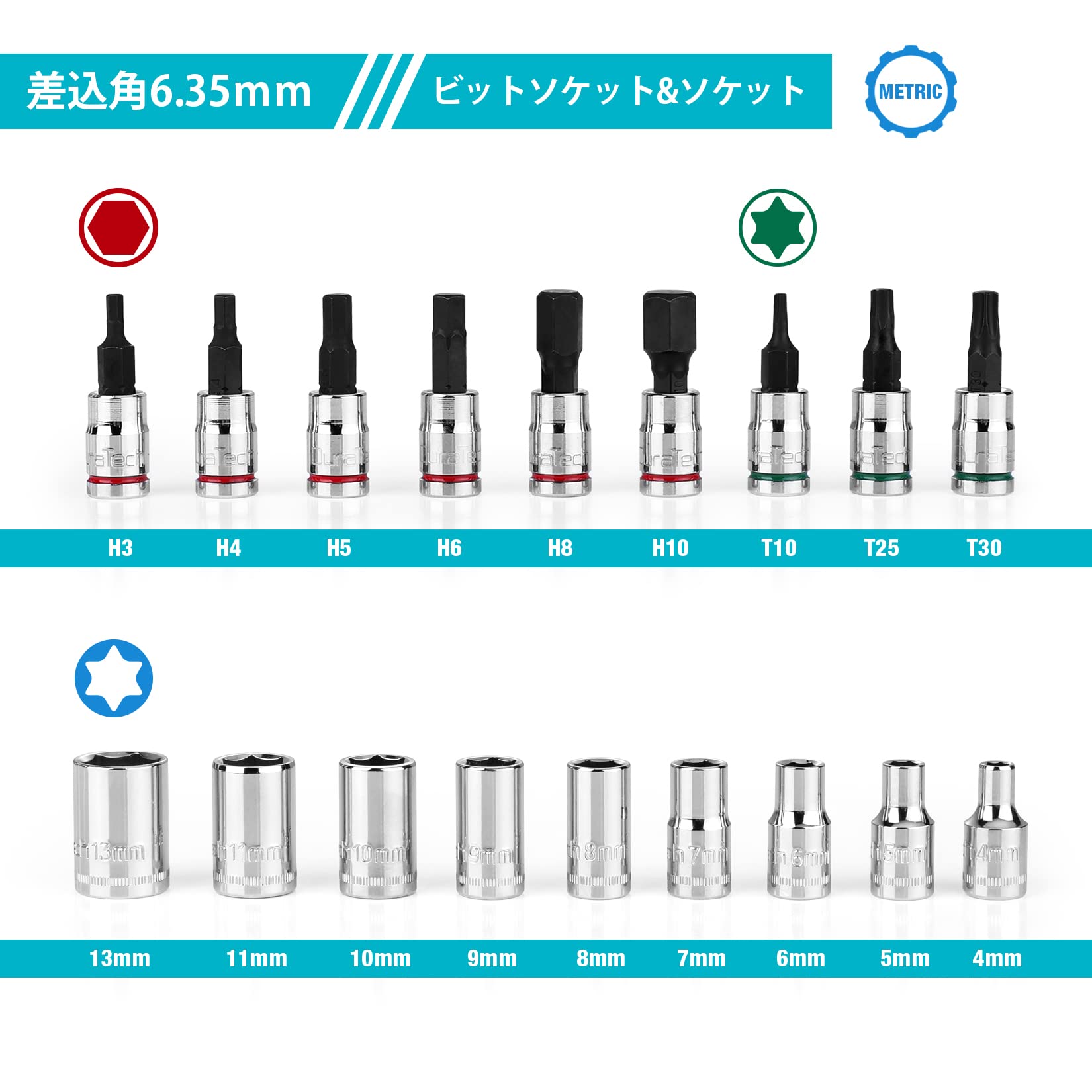 【セット内容】差込角6.35mm(1/4インチ)のソケットレンチセットです。クイックリリースラチェットハンドル、エクステンションバー×1、ソケット×9(4、5、6、7、8、9、10、11、13)、ビットソケット×9(H3、H4、H5、H6、H8、H10、T10、T25、T30)。