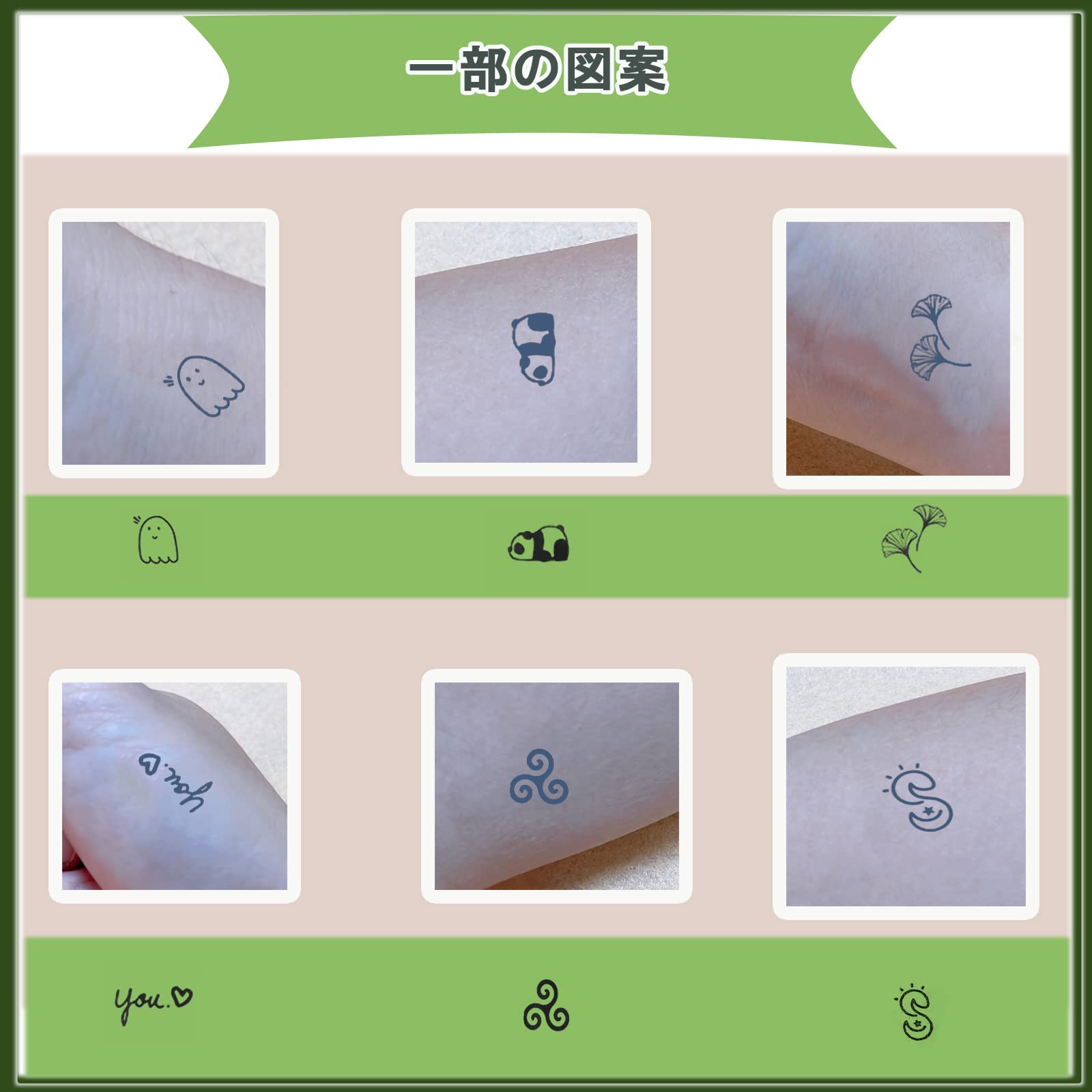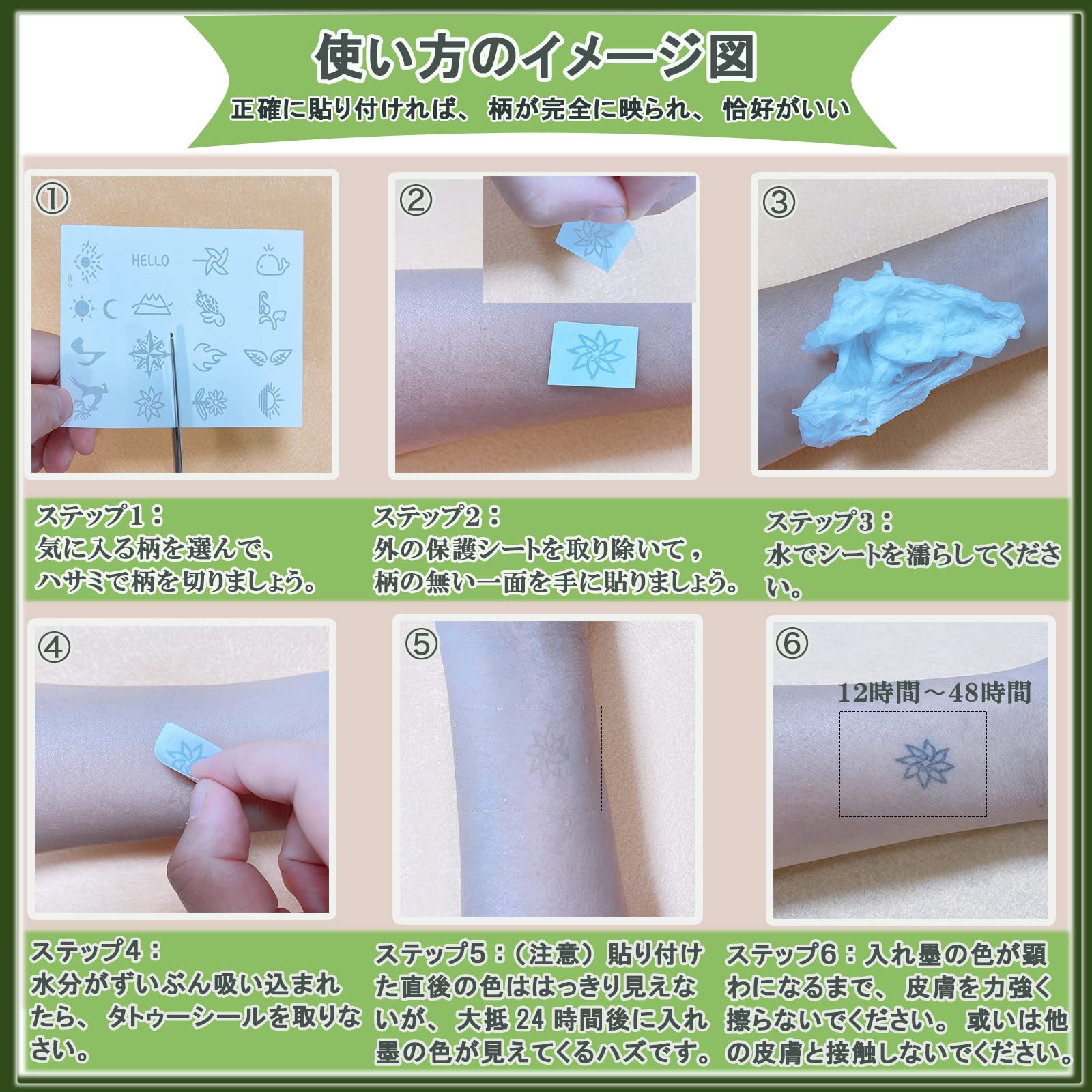 【貼り付け方法】ステップ1:気に入る柄を選んで、ハサミで柄を切りましょう。ステップ2:表面の透明フィルムを剥がして、柄の無い一面を手に貼りましょう。ステップ3:水でシートを濡らしてください。ステップ4:水分がずいぶん吸い込まれたら、タトゥーシールを取りましょう。ステップ5:貼り付けた直後の色ははっきり見えないが、約24時間後に入れ墨の色が見えてくるはずです。ステップ6:入れ墨の色が顕わになるまで、皮膚を力強く擦らないでください。或いは他の皮膚と接触しないでください。