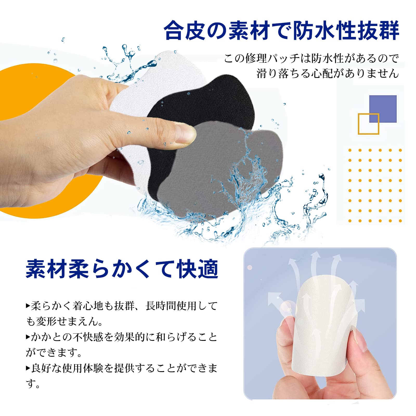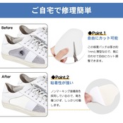 【粘着性が強い&自由にカット可能】 裏面のステッカーをはがして穴に直接貼り付けるだけです。この修理パッチは防水性があり、粘着性が強く、かかと部分に貼ると、滑り落ちる心配がありません。損傷した場所に貼り付けて平らに押します。すり切れた部分をしっかりガードします。また、ノンマーキング接着剤を採用しているので、靴を傷つけません。 &この修復パッチは厚さ約1mmと薄型なので、さまざまなサイズや形にカットしたりすることができ、靴に合わせて自由にカット調整できます。貼る前に一度かかとに当ててサイズを見て、大きい場合はハサミで適切にカットしてください。