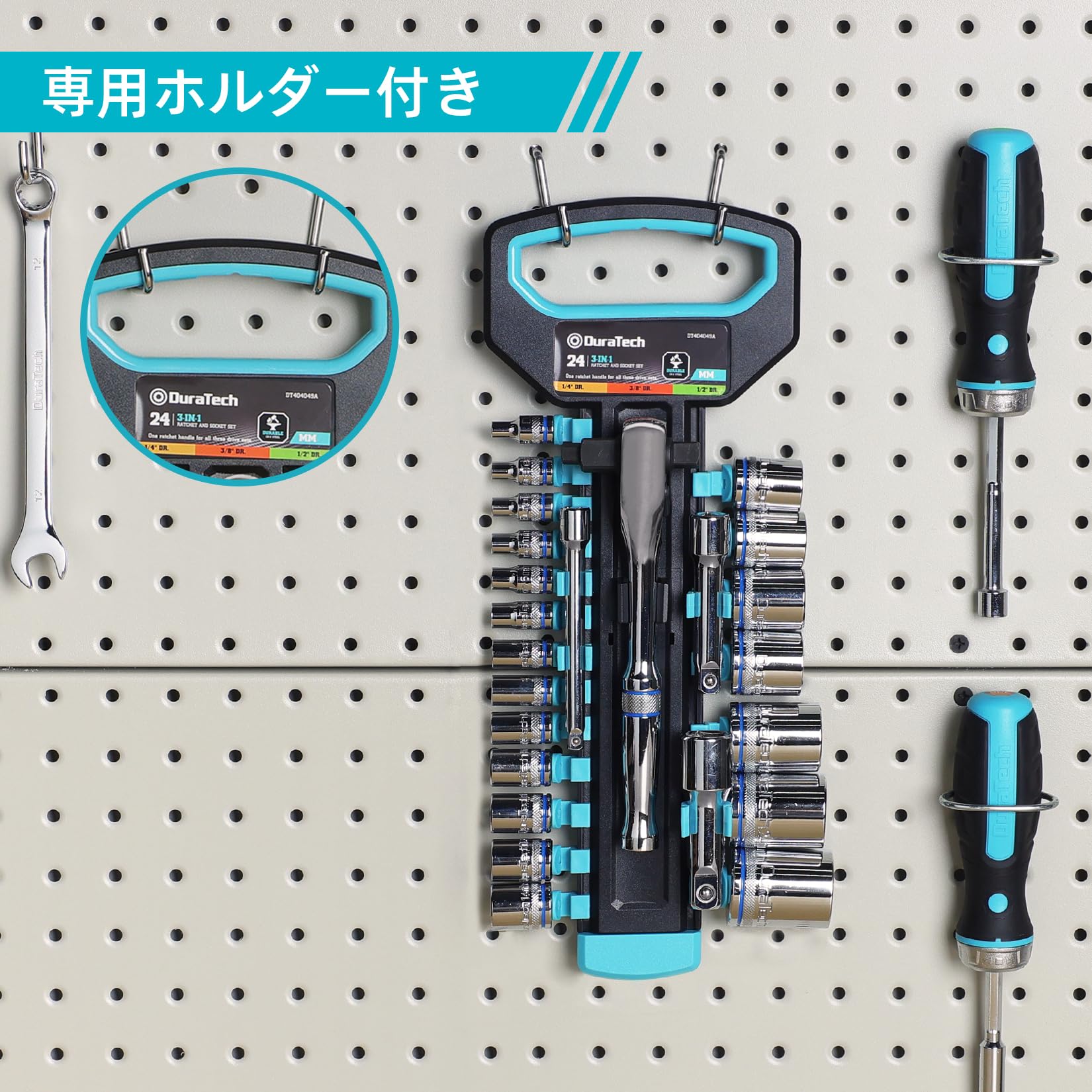 (送料込)DURATECH ソケットレンチセット ラチェットレンチ 24点組 3in1 ラチェットハンドル 差込角6.35mm 差込角9.5mm 差込角12.7mm エクステンションバー3点 ソケット20点 メンテナンス用 自動車 車 バイク 車いじり 整備工具 【収納ホルダー付き】 | デイリーメインベース
