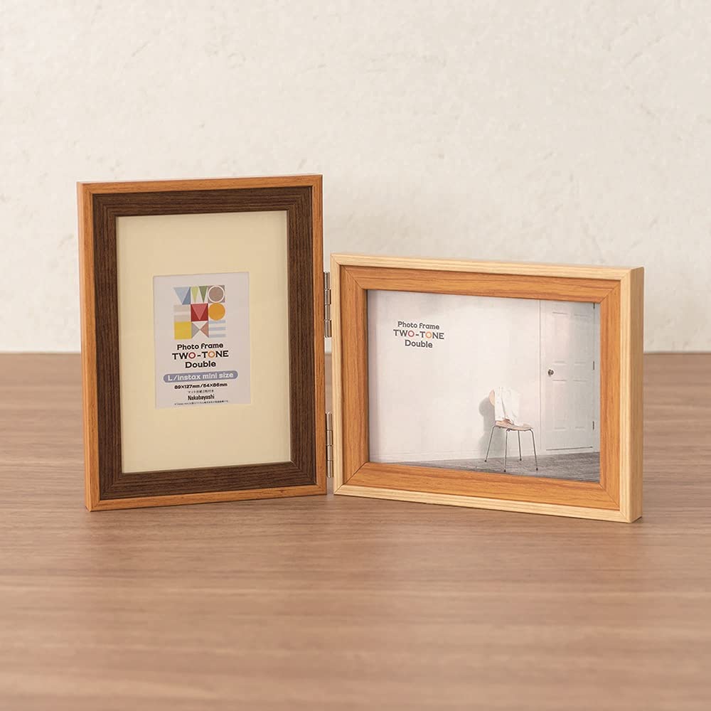 2種類の木目柄を合わせたツートンカラーのフォトフレーム。便利なマット台紙付。2種類のサイズに対応できます。