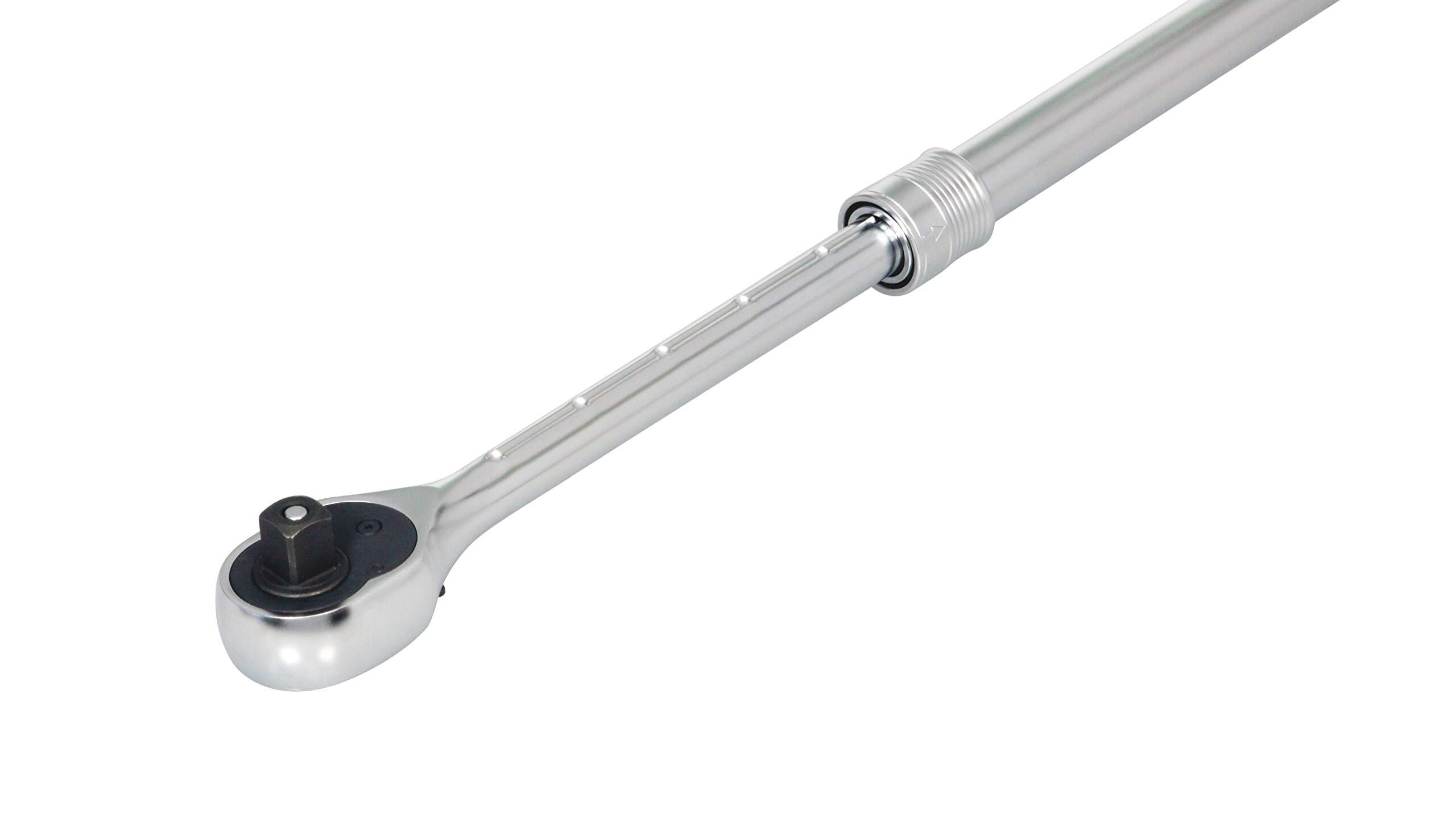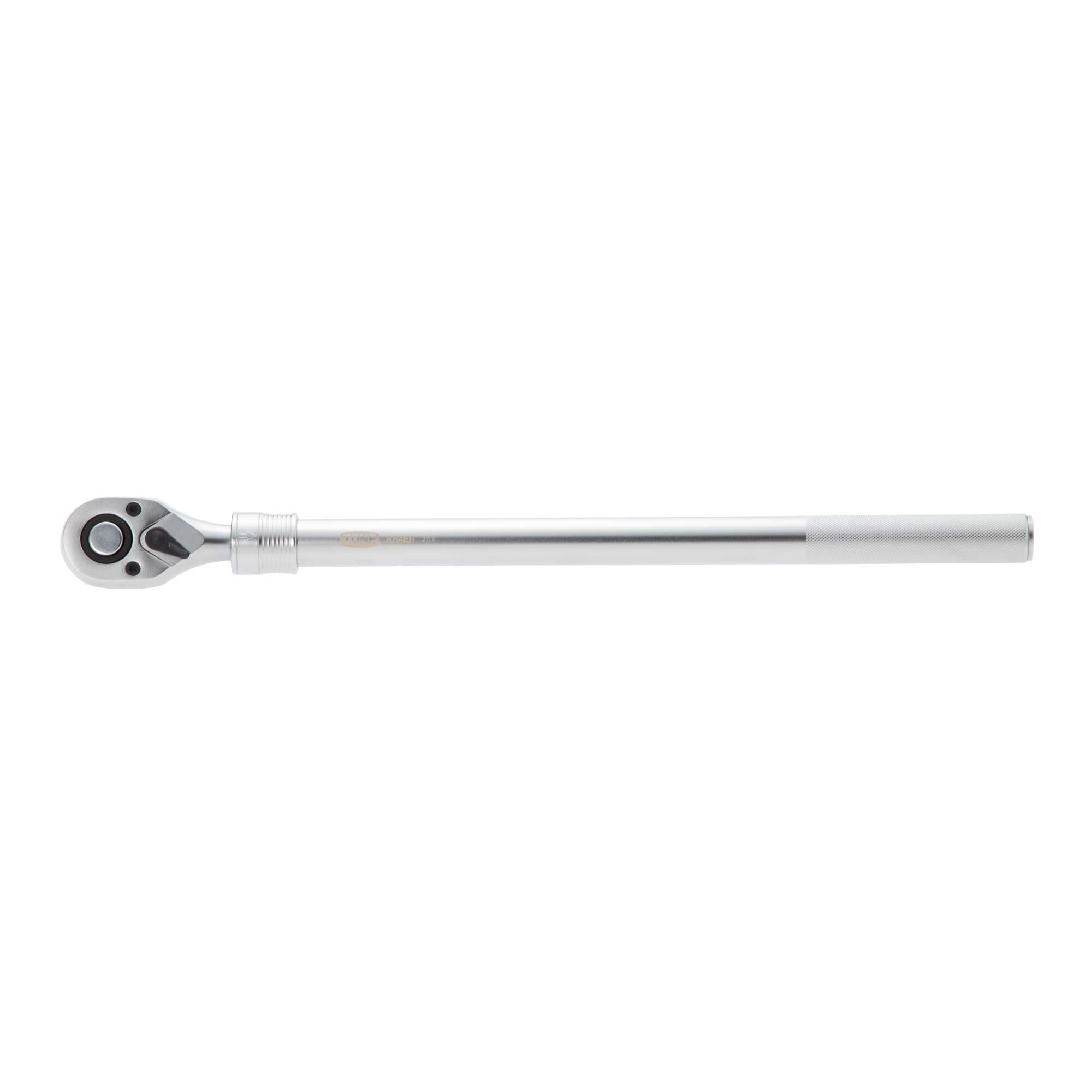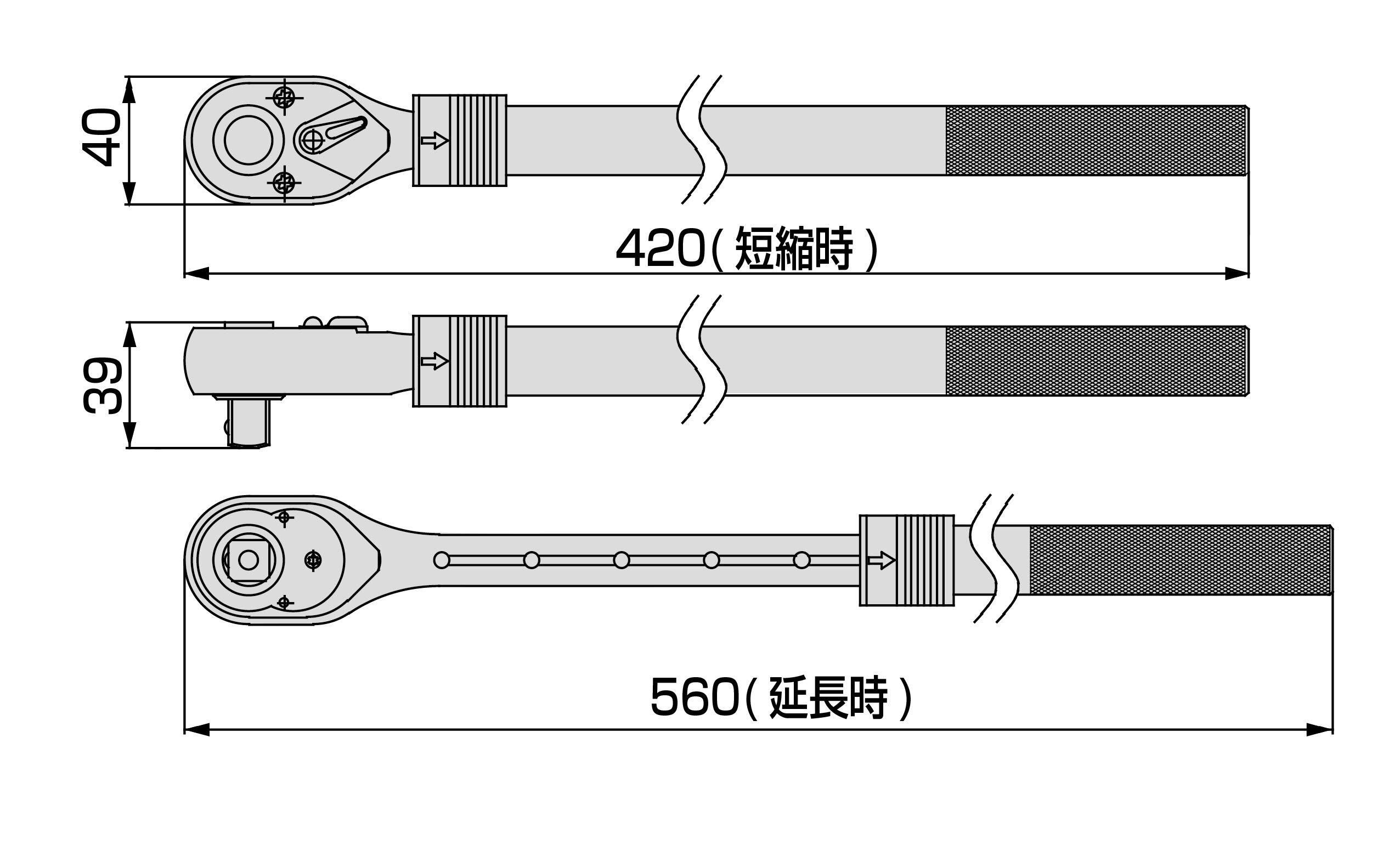 ボディのスライドロックを引くことで420mm~560mmまで全長を6段階に調整できるラチェットハンドル。