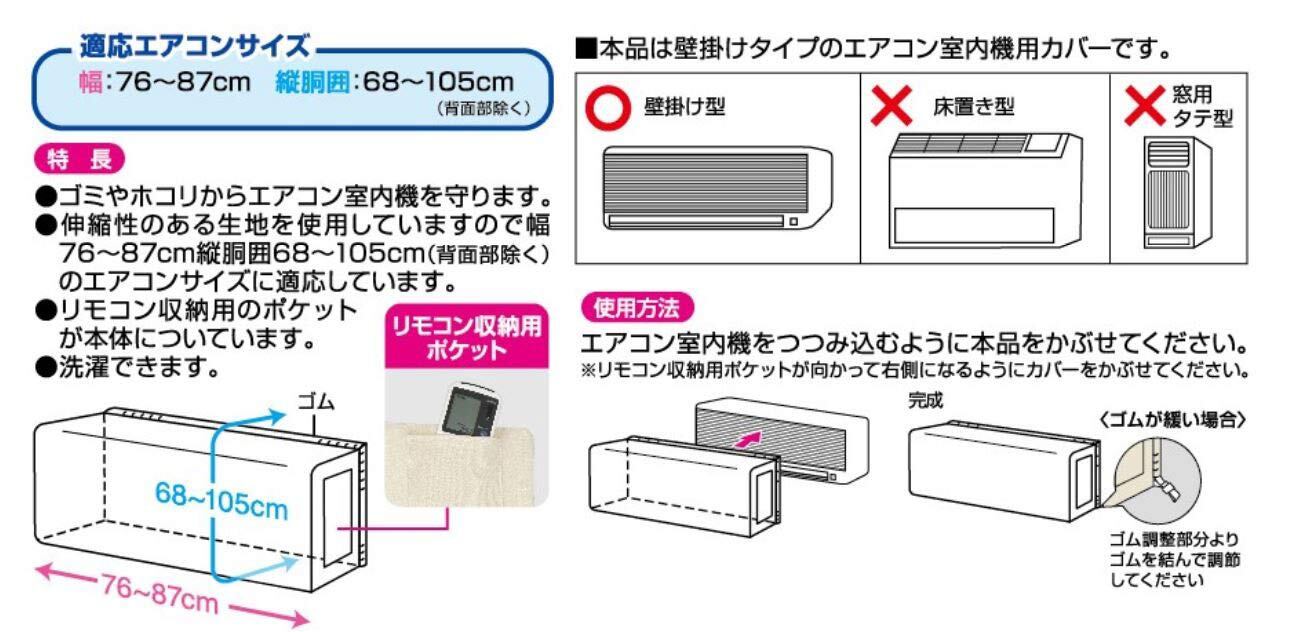 ●伸縮性のある生地を使用しているので、幅76~87cm、縦胴囲68~105cm(背面部除く)のエアコンサイズに適応