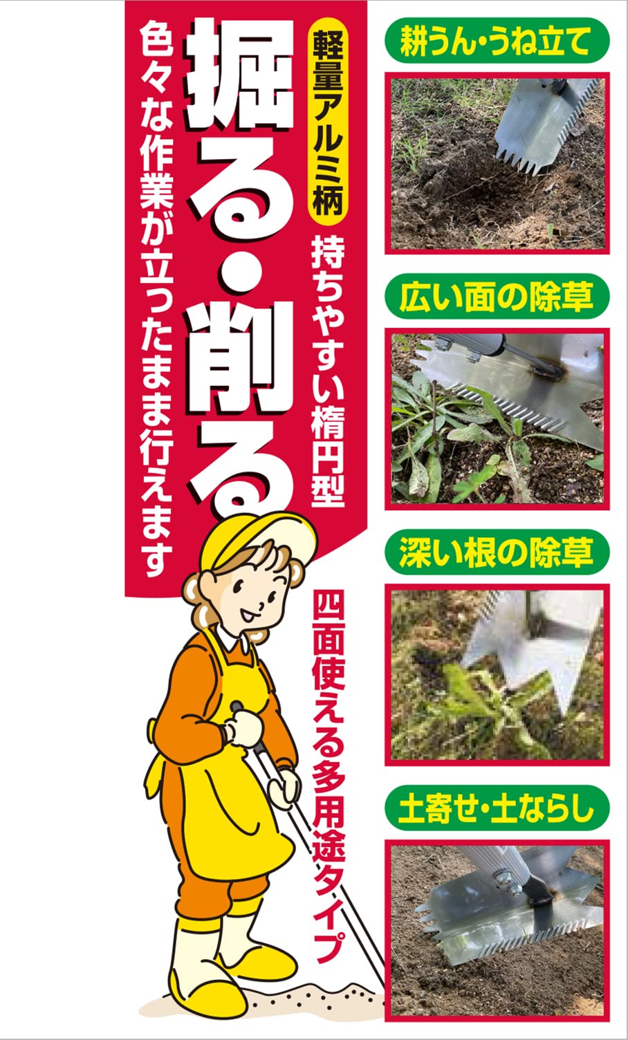 ・耕うん・うね立て、広い面の除草、深い根の除草、土寄せ・土ならしなど多用途に使える