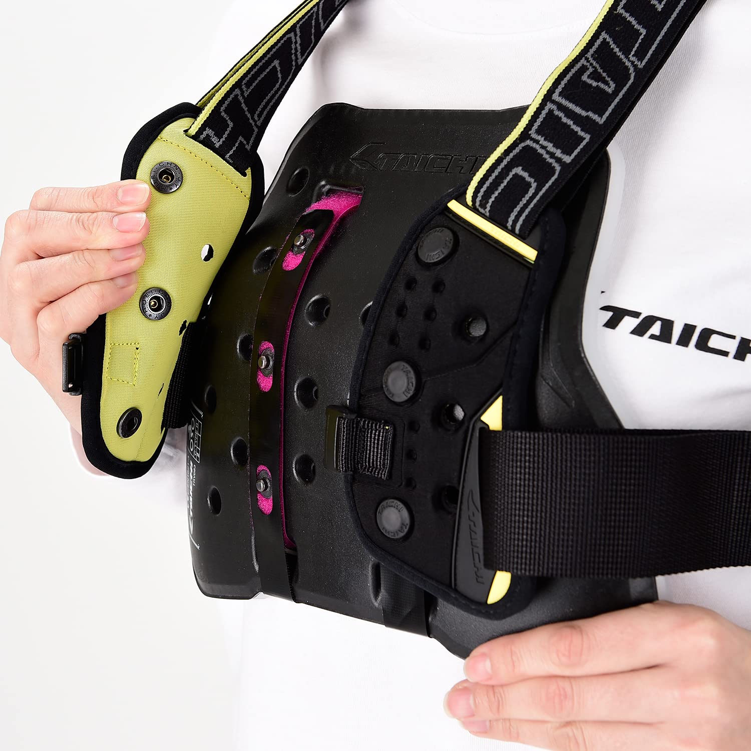 CPS(チェストプロテクターシステム)用のフィッティングベルト。 肩、胴回りのベルトは体格に合わせて長さ調整が可能。ボタンシステムがないジャケットを着用する際に使用することでチェストプロテクターを身体に装着することができます。