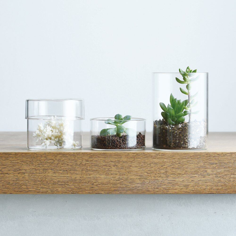 理化学用品のようなガラスケース。無駄のないシンプルなデザインで、リビングやキッチン、バスルームなどさまざまな場所に溶け込み幅広いシーンで活躍