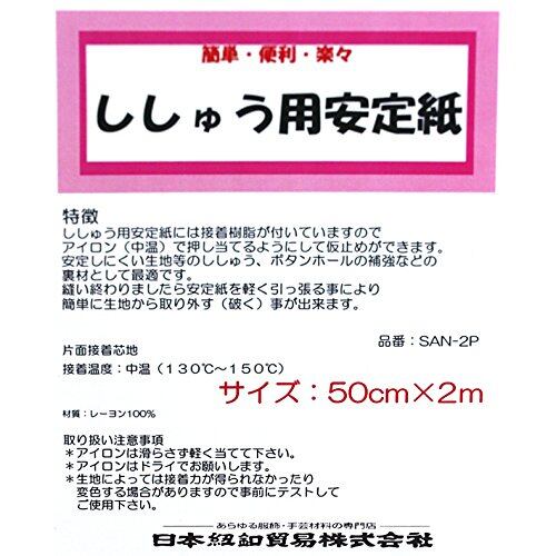 ■サイズ/50cm×2m■素材/レーヨン100%■接着樹脂が付いていますので、アイロンで軽く仮止めができます。安定しにくい生地などの刺しゅう、ボタンホールに最適です。生地の下に敷くことにより、生地を安定させることができ、作品をより良く仕上げる事が可能です。ししゅう・装飾縫いなどが縫い終わりましたら軽く刺しゅう用安定紙を引っ張って頂くと、簡単に生地から取り外すことができます。