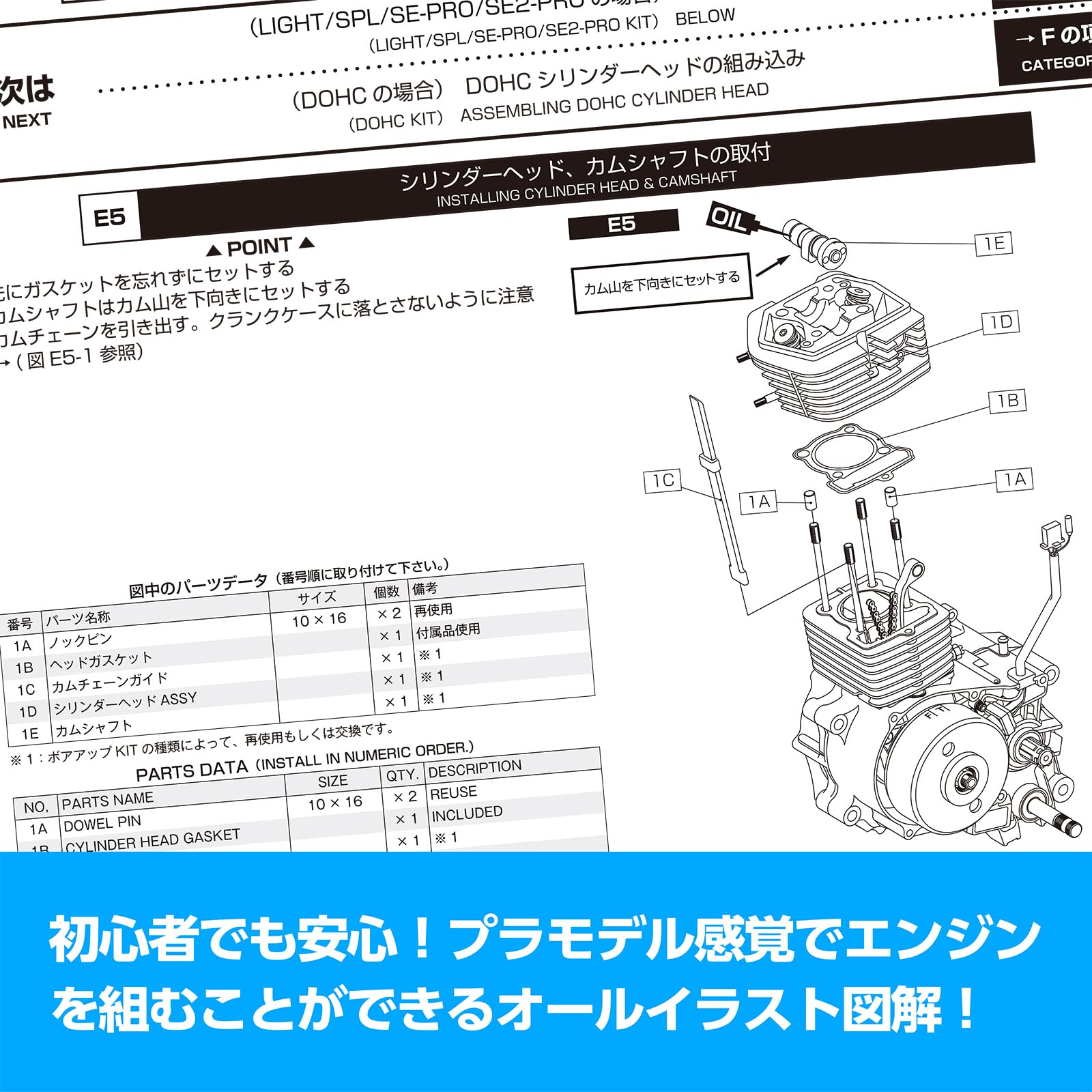 チューニングビギナーに是非お薦めするAPE系ボアアップKIT組み付けマニュアルです。シリンダーヘッドからピストン部までの作業を記載した腰上編はエンジンの積み下ろしやLIGHTボアアップからDOHCボアアップKITの組み込みまでを掲載。