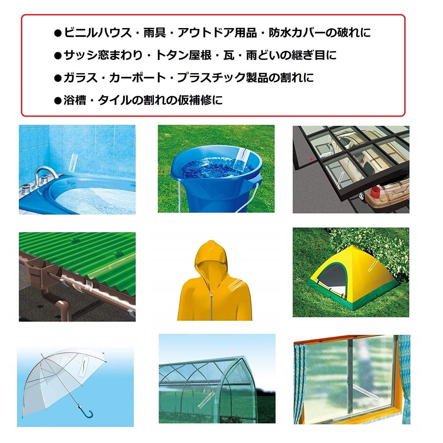 ・広範囲の材料にもビニルハウス・雨具・アウトドア用品・防水カバーの破れ、サッシ窓まわり・トタン屋根・瓦・雨どいの継ぎ目など