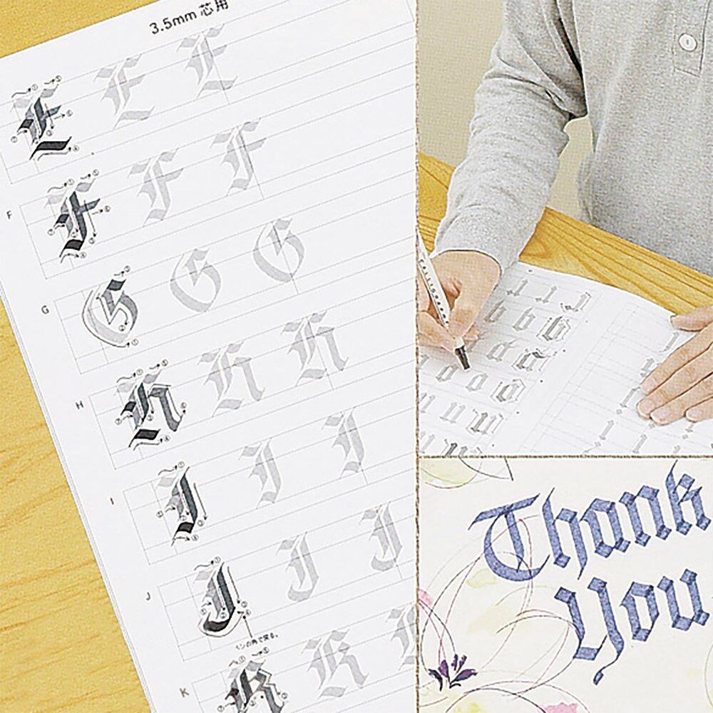 カリグラフィーゴシック体の練習帳です。基本からテクニックまでを楽しみながら練習できます。