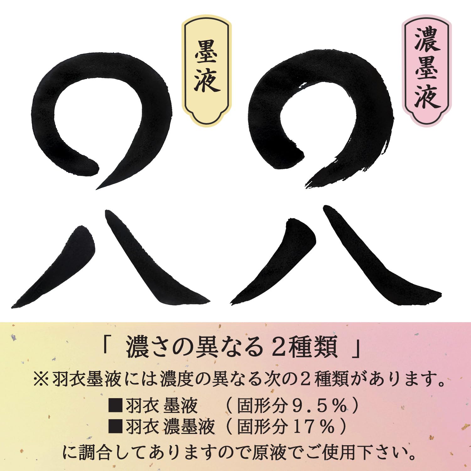 固形墨の持つ条件、書き味・のび・紙への浸透性表具性をすべて備えた液体墨。濃墨タイプ。