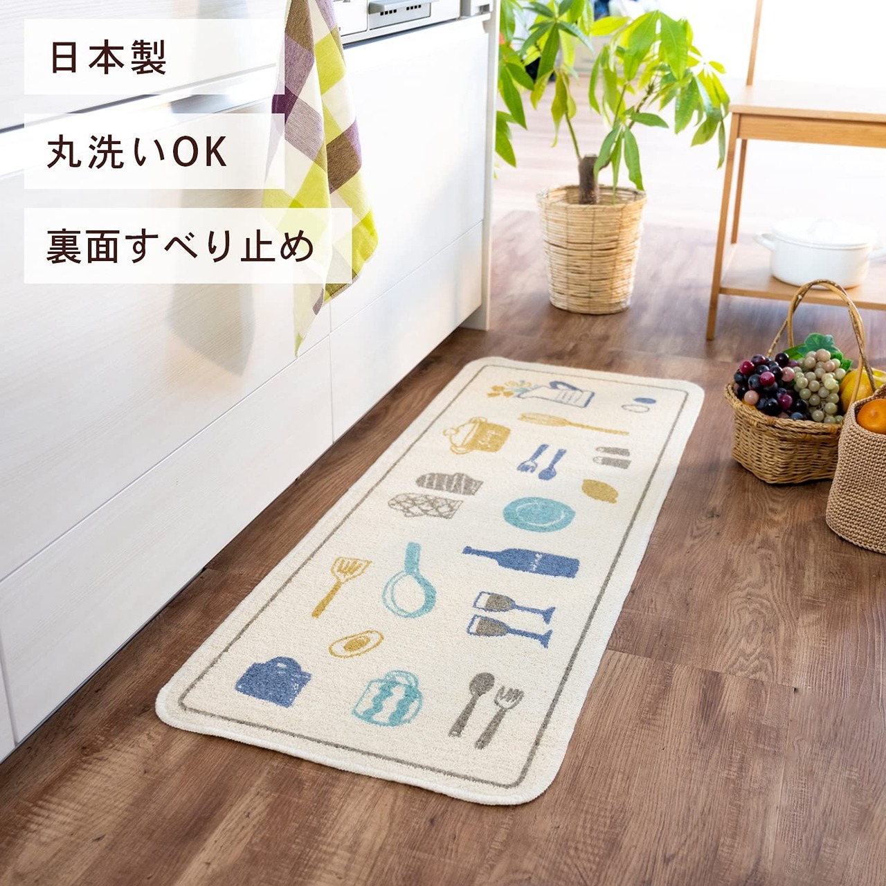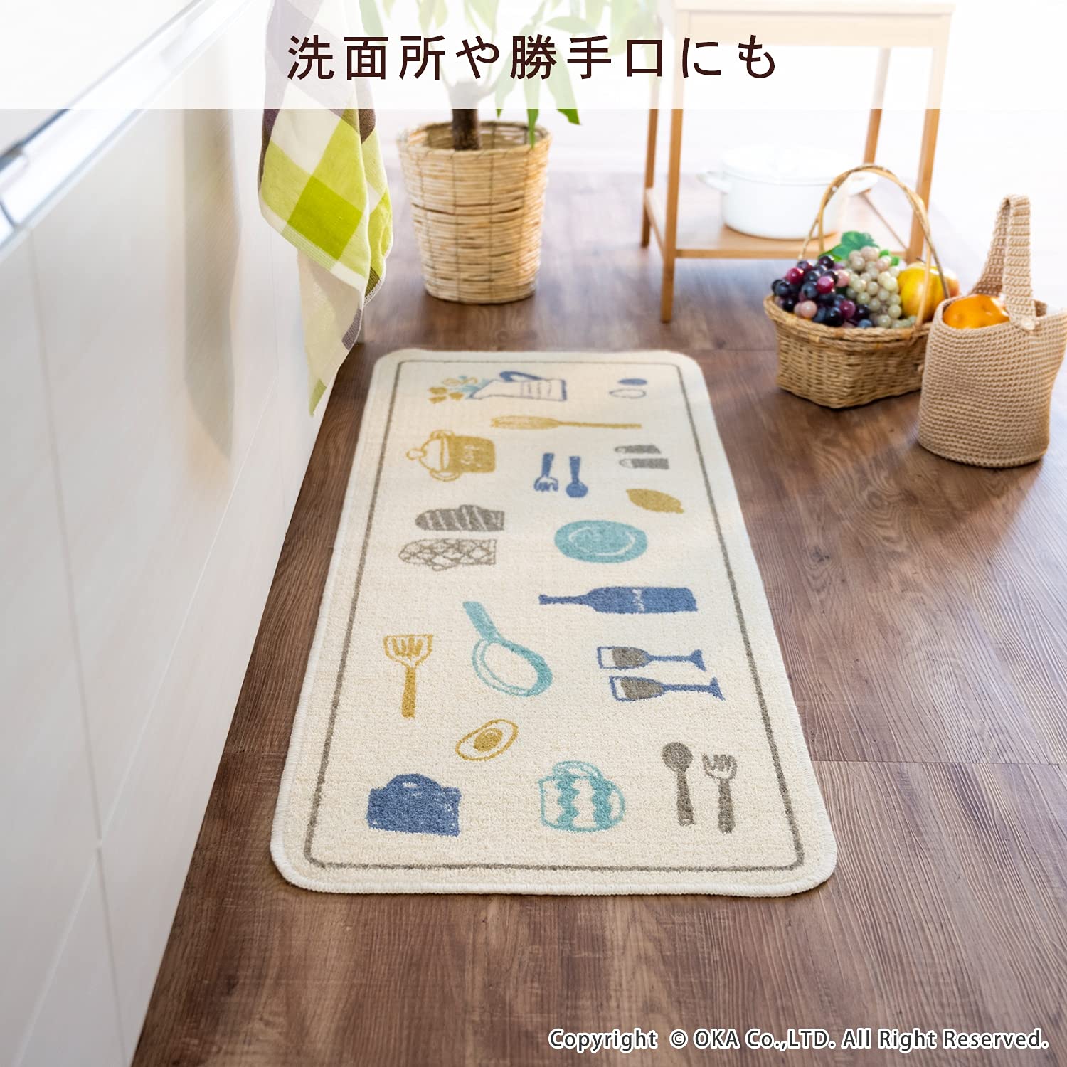 オカ(OKA) ビストロ キッチンマット 約45cm×120cm ブルー (台所マット 日本製 すべり止め)