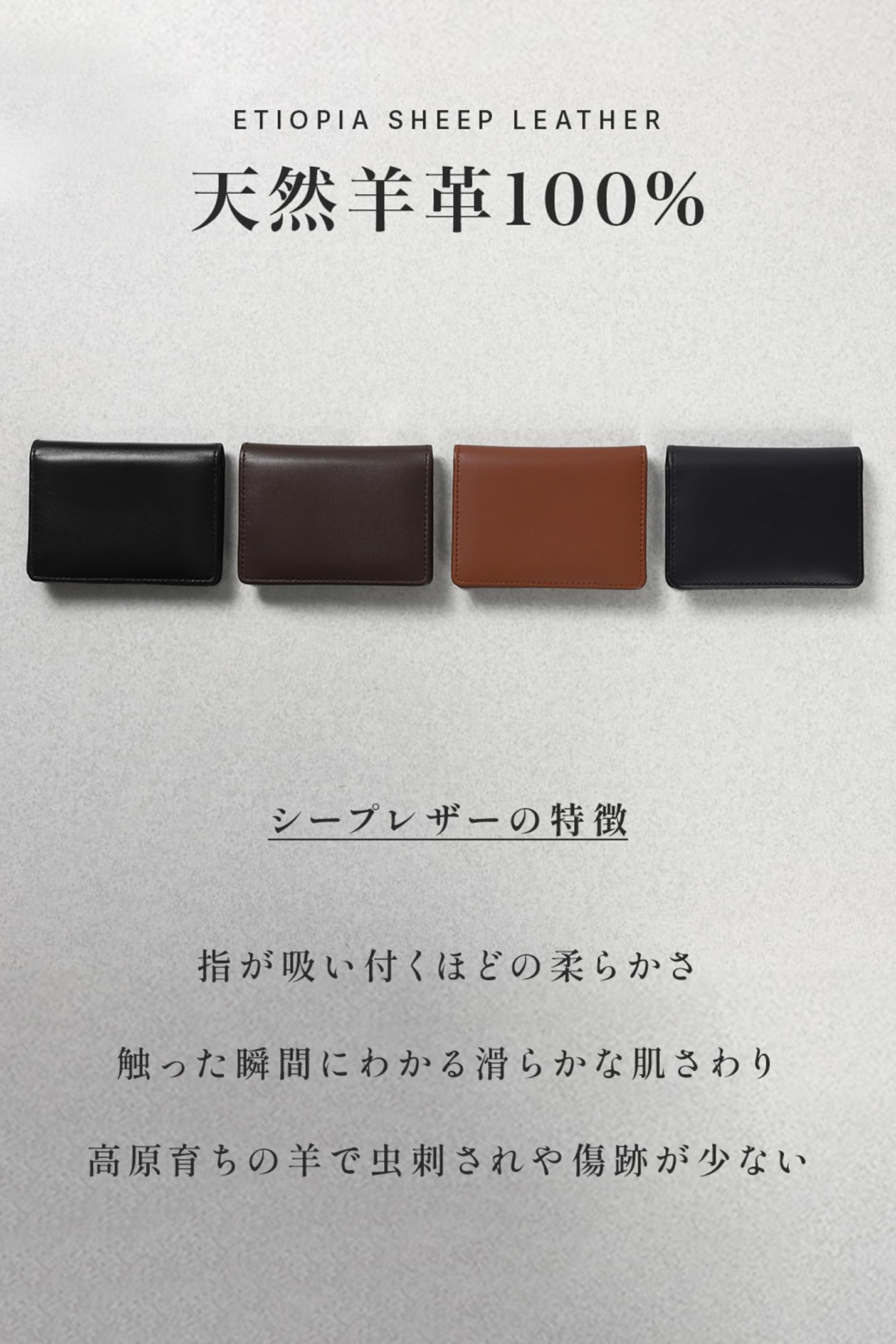 【本革】エチオピア産のシープレザー(本革)100%の名刺入れです。光沢が少なく、しっとりと手に吸い付くような質感です。シープレザーの特徴として、牛革に比べて軽量で柔らかく、しっとりとした肌さわりになります。高級ブティックでもフラッグシップ(最上位)の位置付けで取り扱われることがあります。広大なエチオピア山脈で悠々と育った山羊たちは蚊にさされにくく、非常に綺麗なレザーとなります。牛革製品に比べて、柔らかく、しっとりとした質感のため、乱暴に扱わず繊細に扱う必要があります。