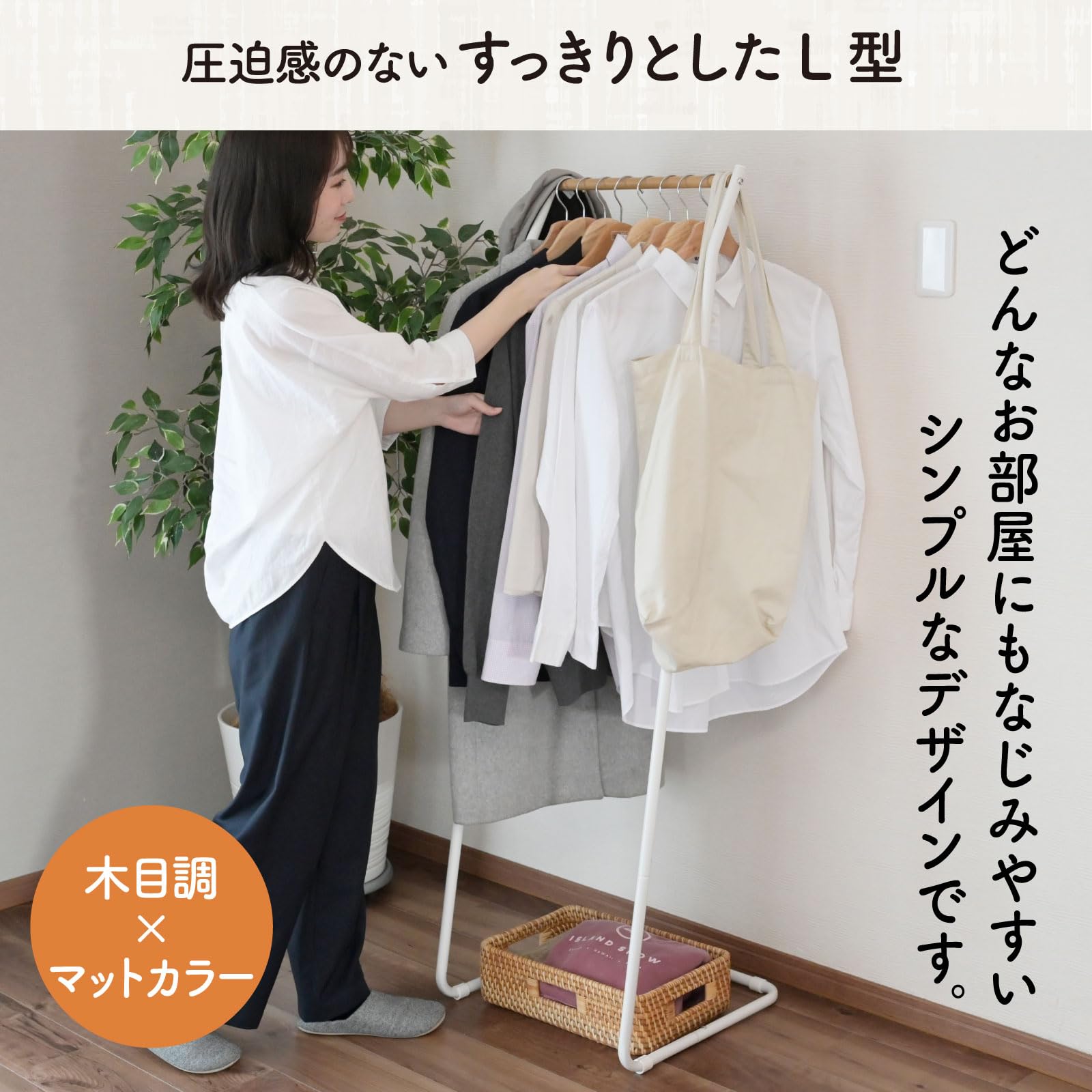 【L型で省スペース】圧迫感のないすっきりとしたL型デザインのハンガーラックです。木目調とギラつきをおさえたマットな色味でどんなお部屋にもなじみやすいです。