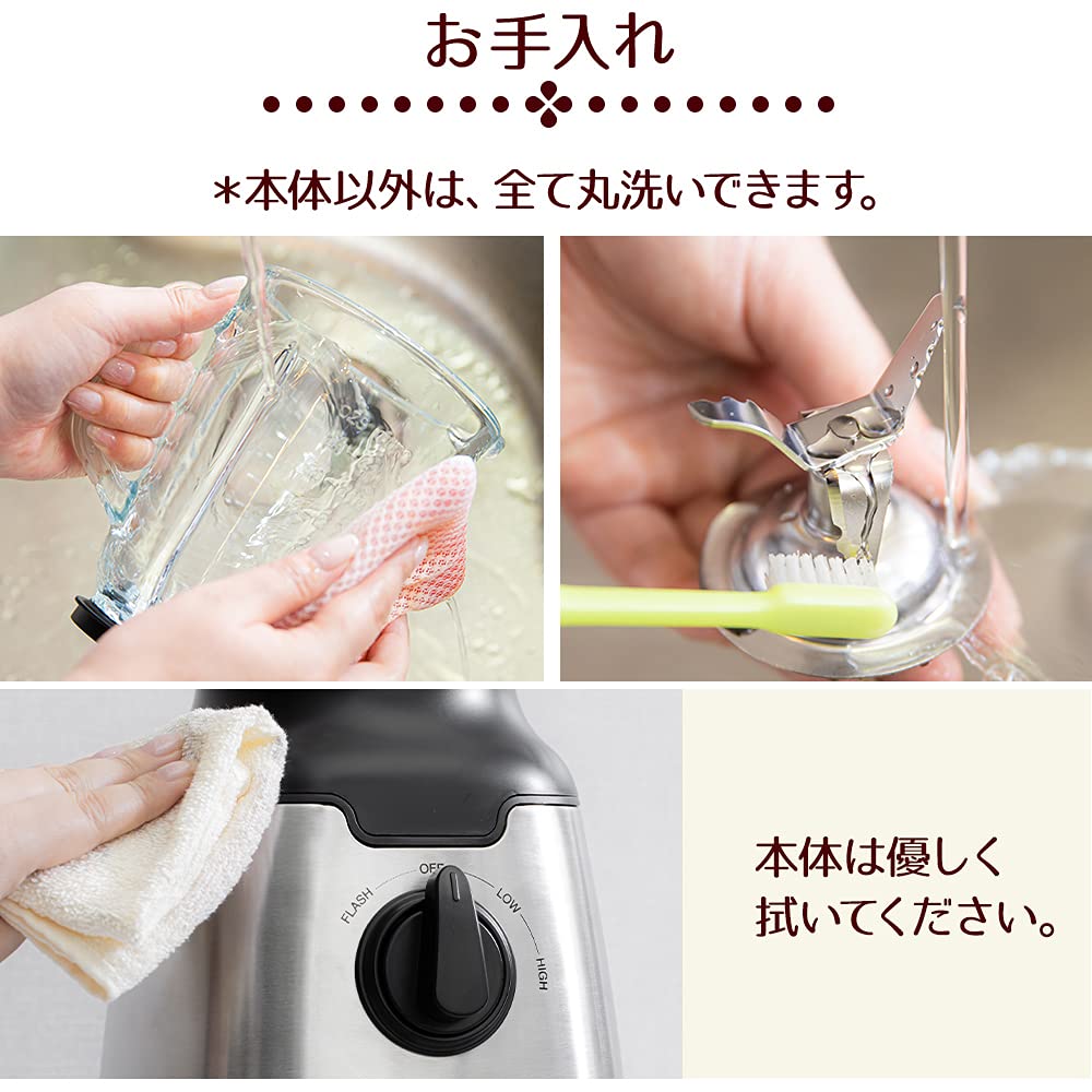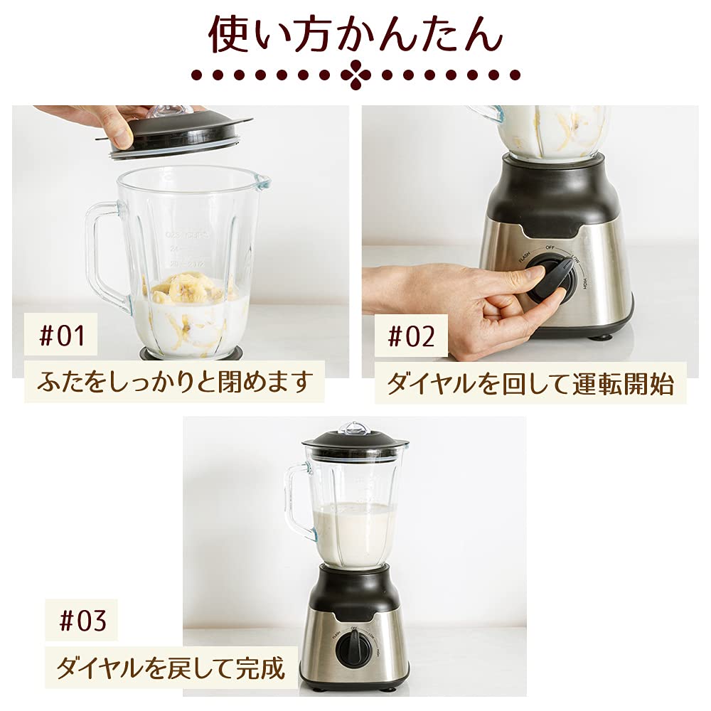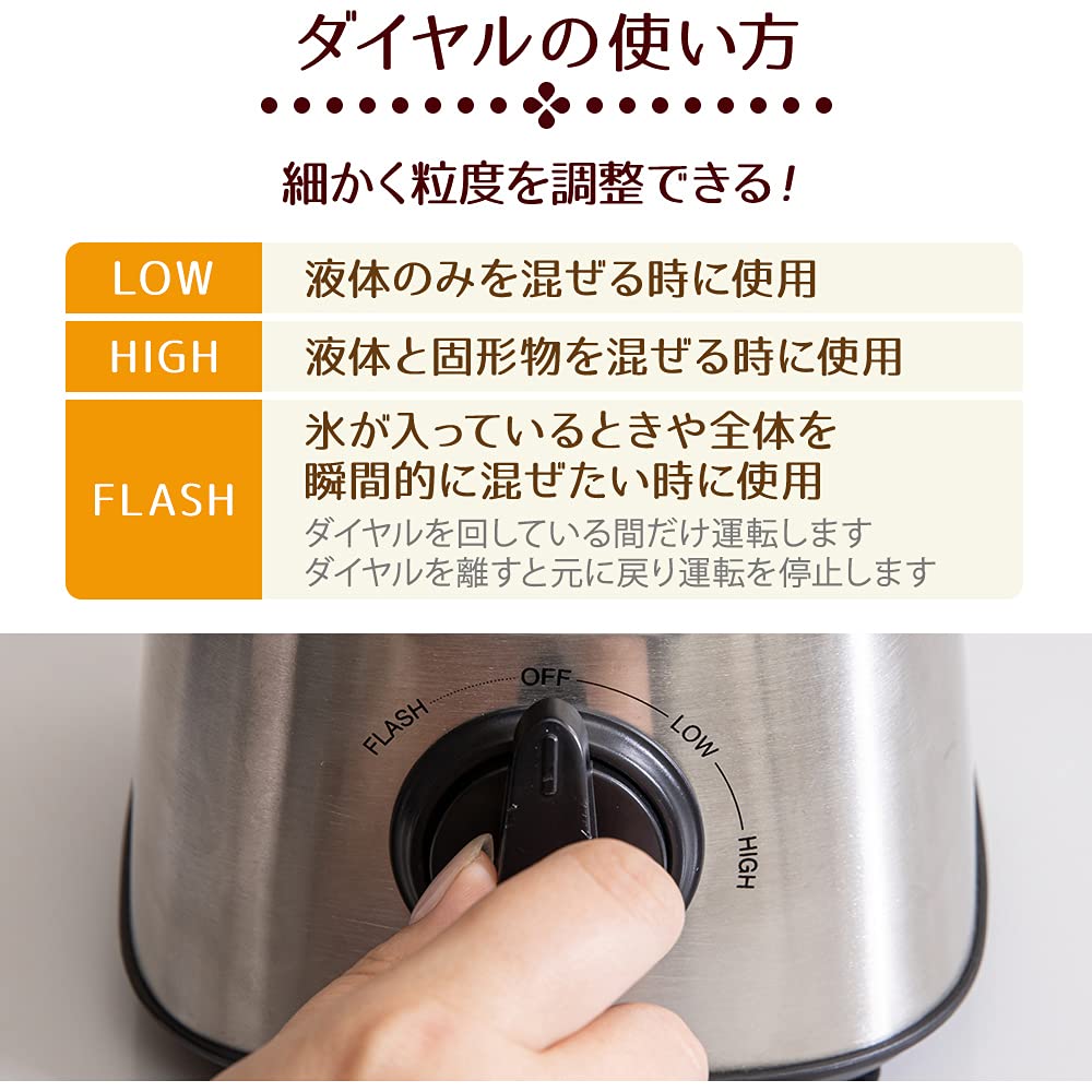 【操作方法】①具材を入れ、しっかりと蓋をします。②お好みでダイヤルを回して運転を開始します。③ダイヤルを戻して停止!完成です【ダイヤル3段階調整】①LOW:液体のみを混ぜるときに使用。②HIGH:液体と固形物を混ぜるときに使用。③FLASH:氷が入っているときや全体を瞬間的に混ぜたいときに使用。