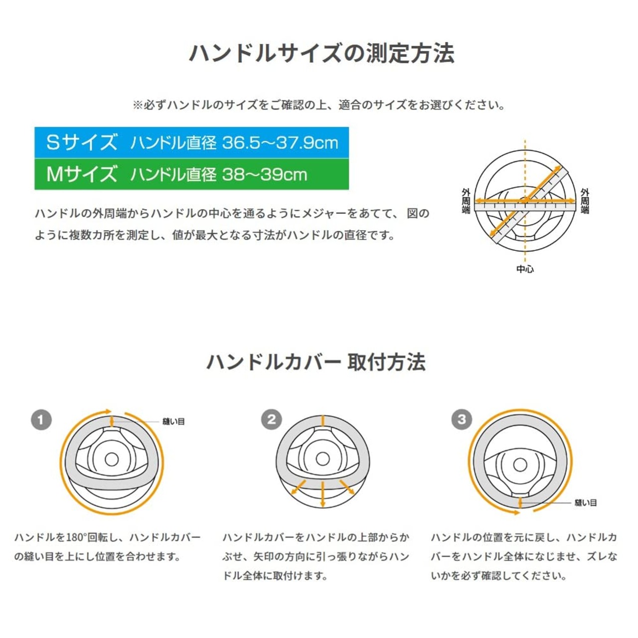 Mサイズ:直径が38cm~39cmのハンドルに装着可能です。