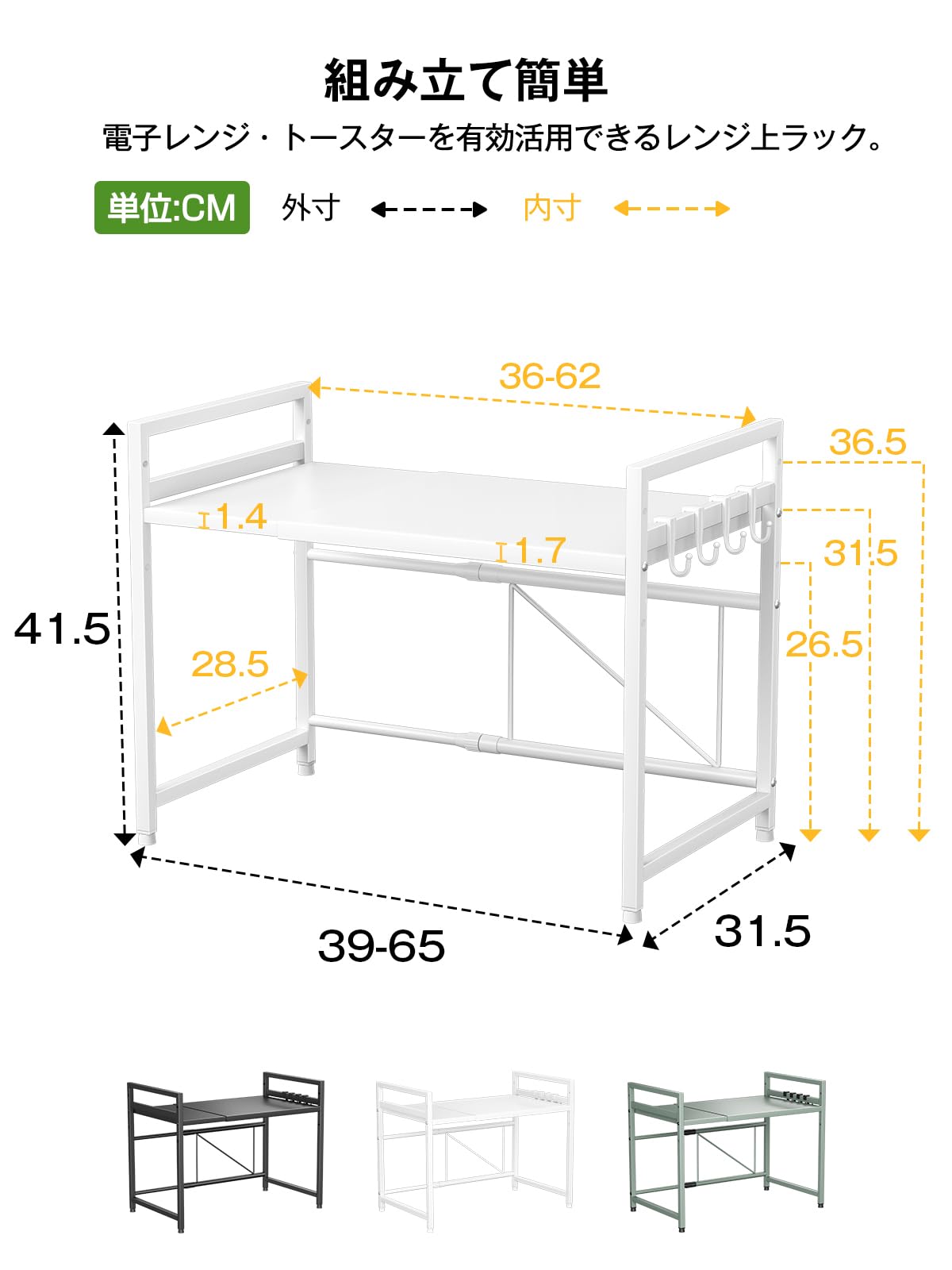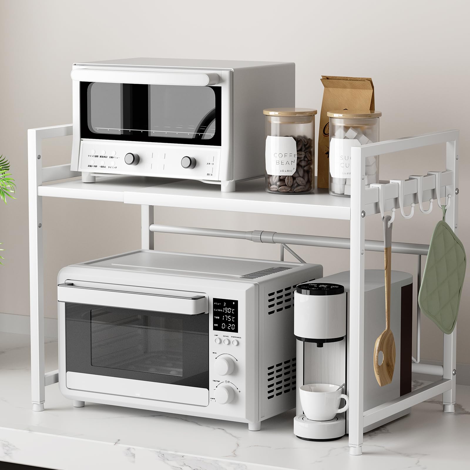 TKUIN レンジ上ラック キッチン 伸縮式 トースターラック 幅(39-65cm) 伸縮可 オーブンレンジラック 棚板高さ調節可 電子レンジ 台 収納 耐荷重50kg フック4つ付き 組み立て簡単 おしゃれ (ホワイト)