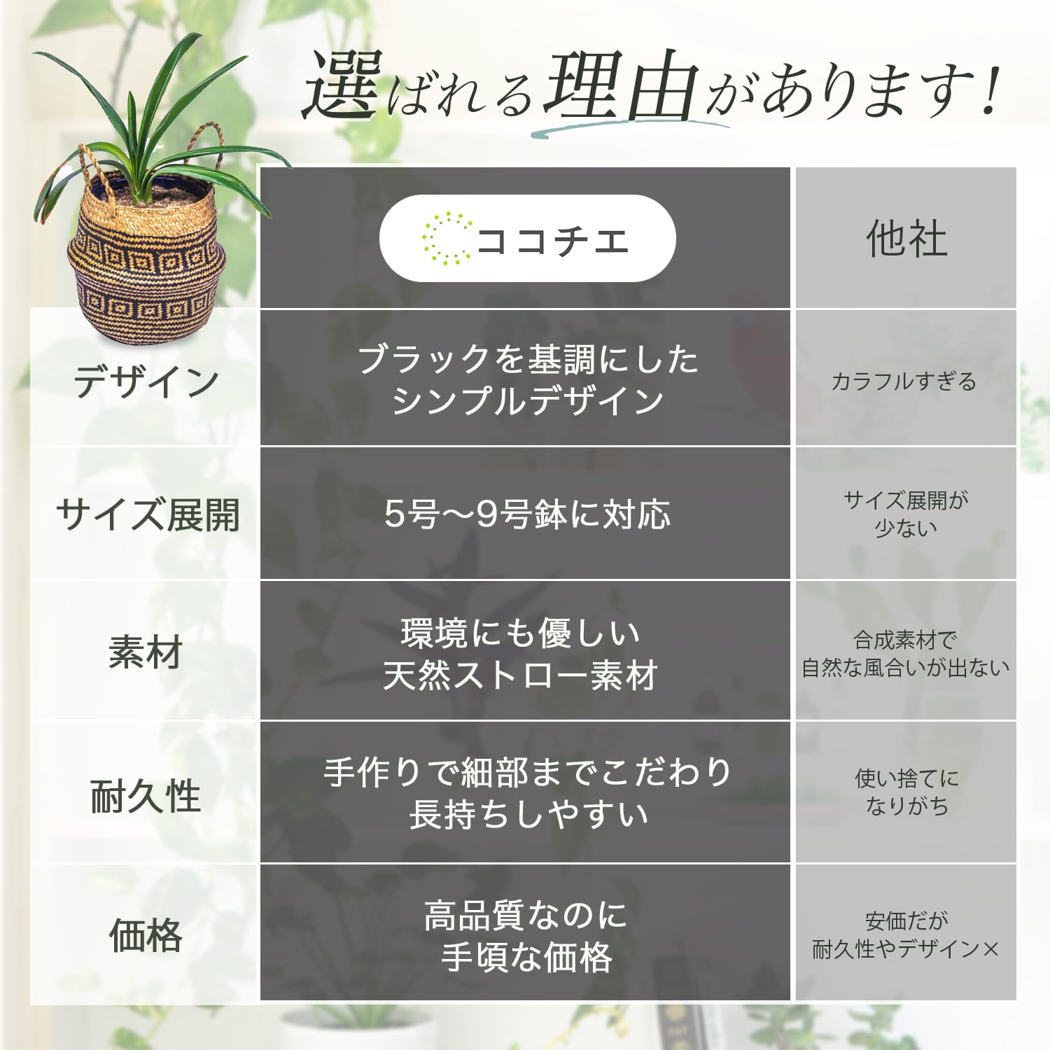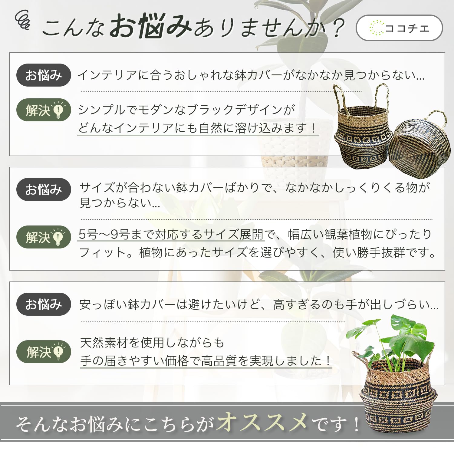 ココチエ 鉢カバー おしゃれ 5号 6号 7号 8号 9号 バスケット 収納 かご 折りたたみ ポット ストローバスケット 柄 ブラック (M)