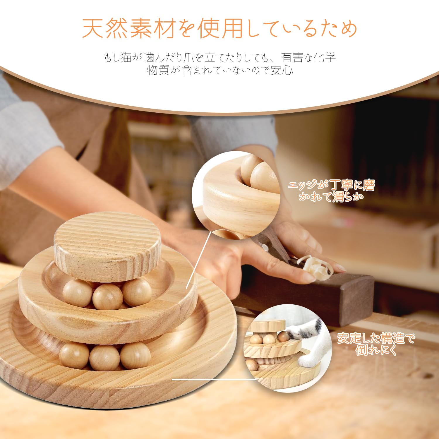 SunStarsPets 木製 猫用回転ボール タワー 組み立て不要 止まらない回転 猫おもちゃ 遊ぶ盤 ストレス解消 運動不足対策 ナチュラル安全素材 寂しさ解消
