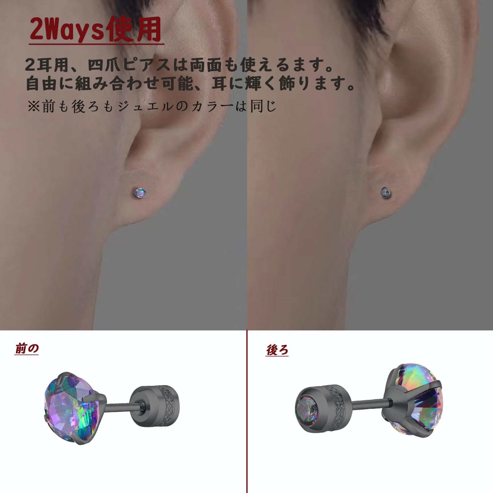 【ジュエル&2WAY使用 】ねじ式のキャッチにも石をはめ込んだデザインですから、リバーシブルで両面が使えます!キャッチタイプでしっかり固定できて外れない、付けたままで寝がえり打っても耳裏に刺さらないんです!