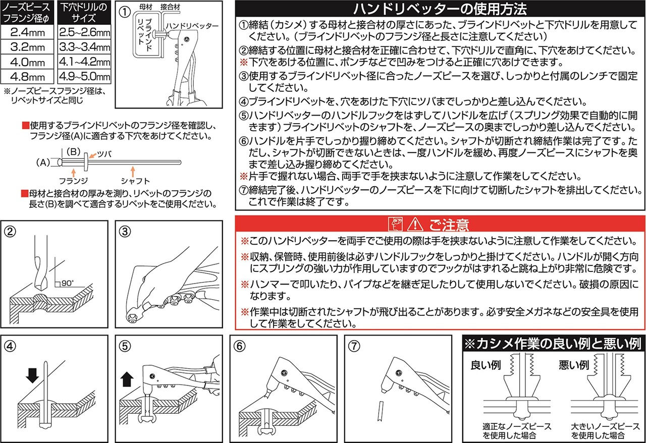 付属リベットサイズ:直径2.4mm、直径3.2mm、直径4.0mm、直径4.8mm