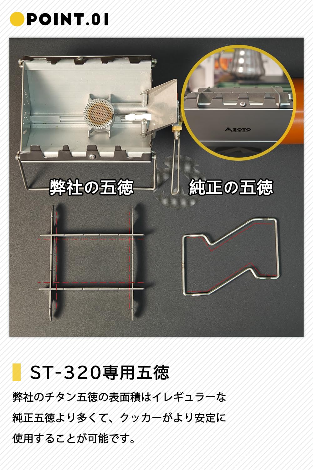 【SOTO Gストーブ ST-320専用ゴトク】SOTO ST-320付属の五徳はカタカタで安定しないため、小さいクッカーなどをのせる場合かなり不安定になってしまいます。本製品を使用することで今までSOTO ST-320の五徳の上で安定しなかったクッカーやサイズが小さく使用することができなかったクッカーが使えるようになっています。