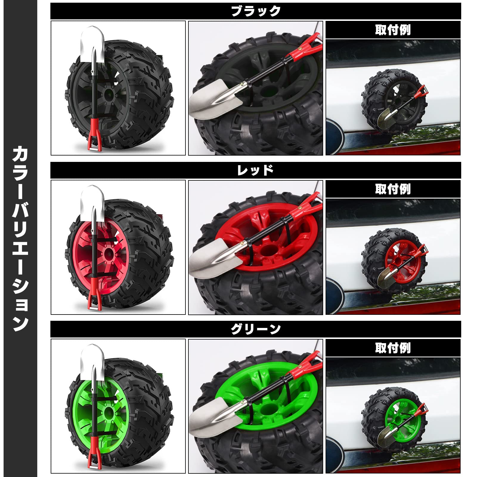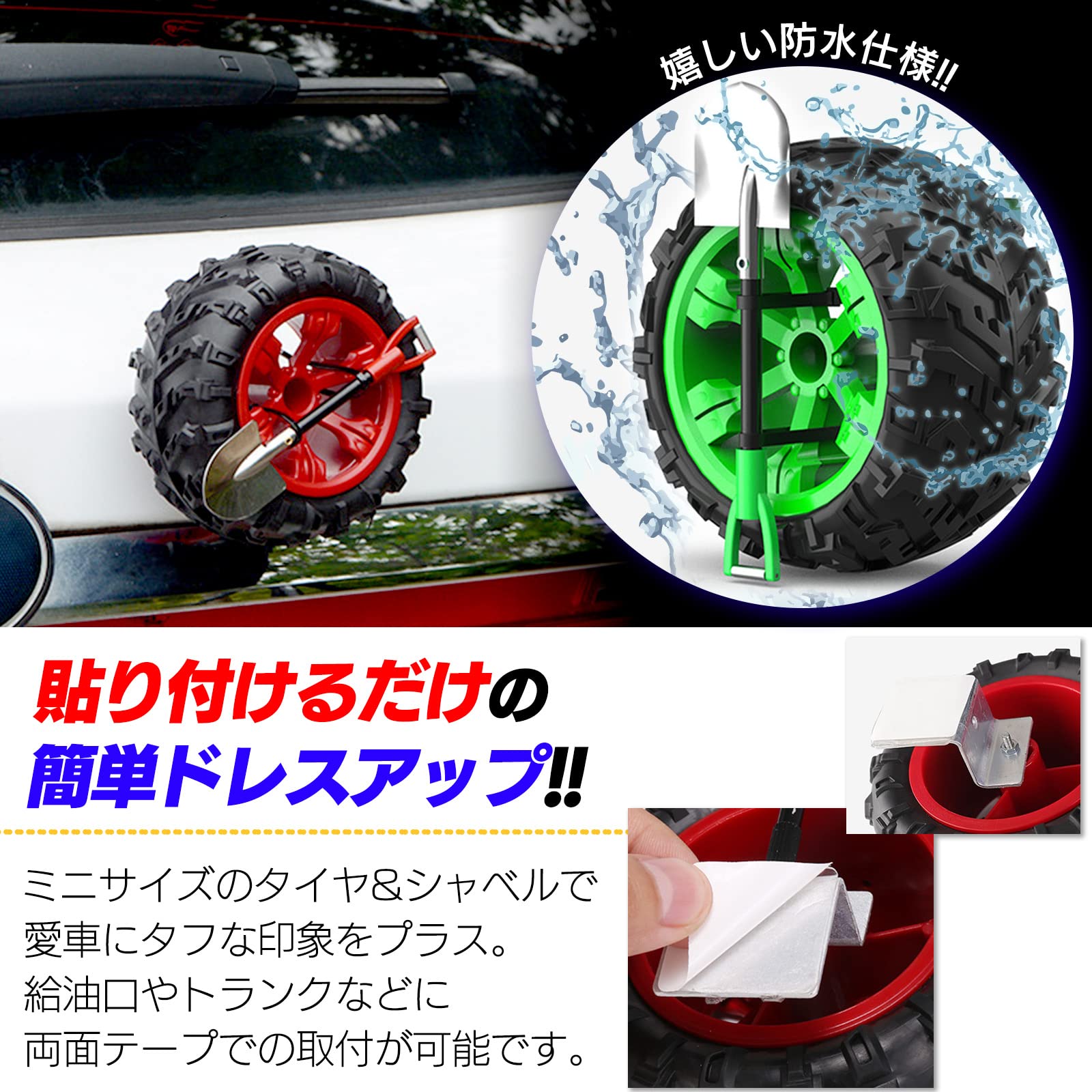汎用タイプのミニスペアタイヤ(ホイール付き)&背面スコップのセットになります。 オフロード専用のスペアタイヤをイメージしたデザインとなっていて、カスタムやドレスアップ、愛車のワンポイント用パーツとしてお楽しみ下さい。 内装、外装ともに両面テープで取り付けできる箇所ならどこにでも装着可能です。