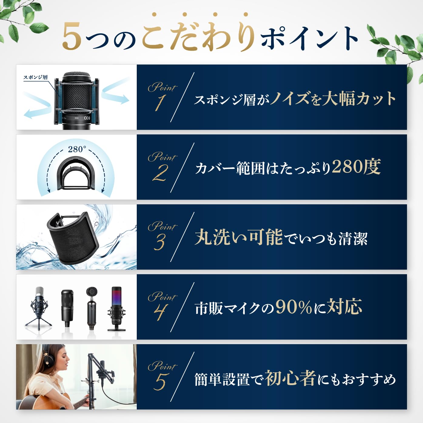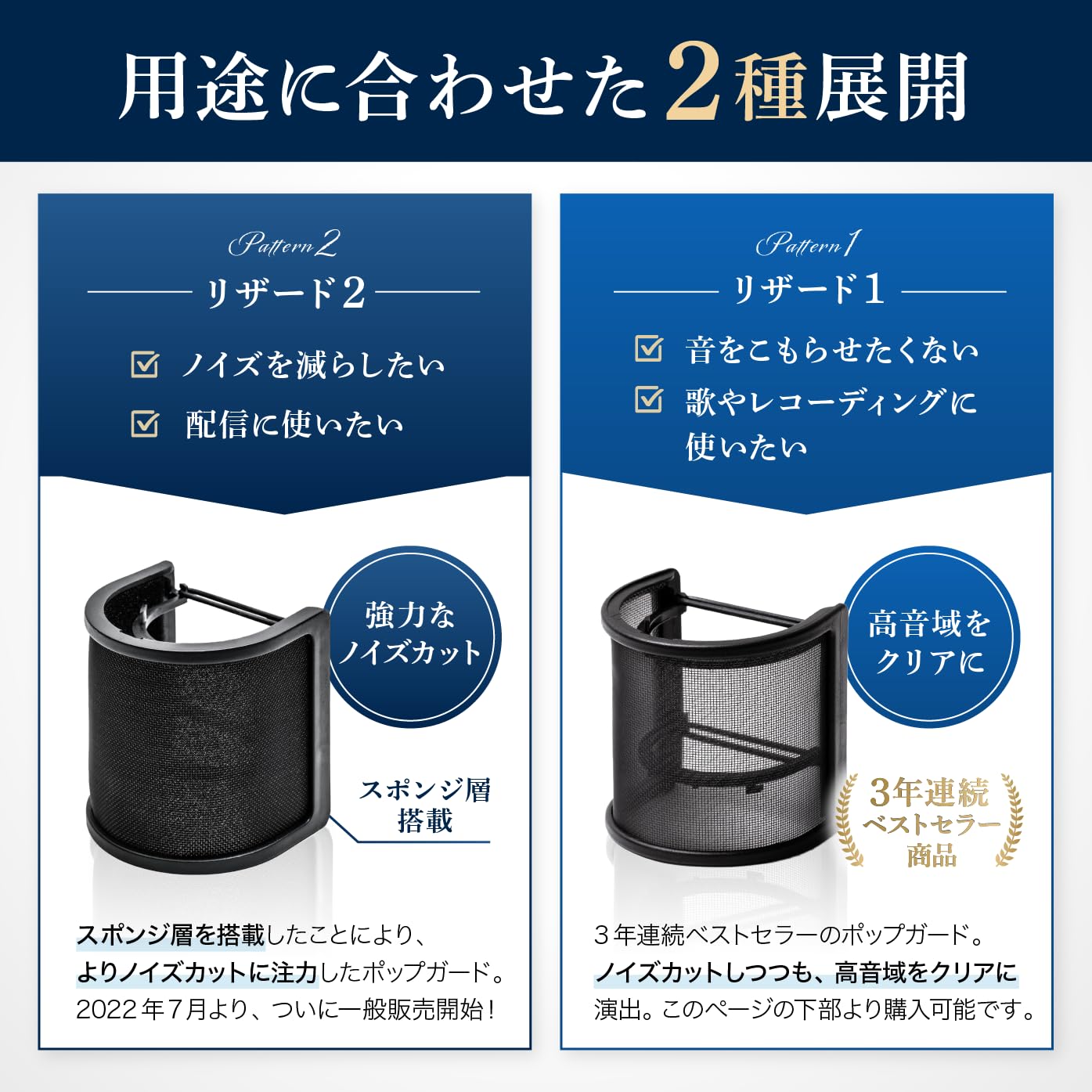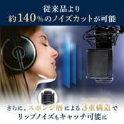 【高いノイズカット性能】既存のU型ポップガードにさらにスポンジ層を搭載したことで、よりノイズカットが可能になりました。従来比で40%もの性能がアップしています。