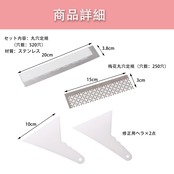 セット内容:丸穴定規(サイズ:約20×3.8cm 穴数:520穴 材質:ステンレス カラー:シルバー)、梅花丸穴定規(サイズ:約15×3cm 穴数:250穴 材質:ステンレス カラー:シルバー)、修正用ヘラ×2点(幅:約10cm カラー:ホワイト)