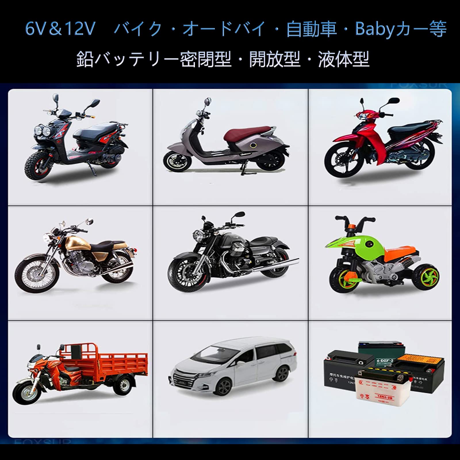 6Vと12V適合:6Vバッテリーも12Vバッテリーも利用できて、設定不要、自動的にバッテリーの電圧を識別、バイク、オートバイク、自動車、おもちゃの玩具、草剃り機等のAGM、GEL、密閉型、開放型の鉛バッテリーは使用できます。