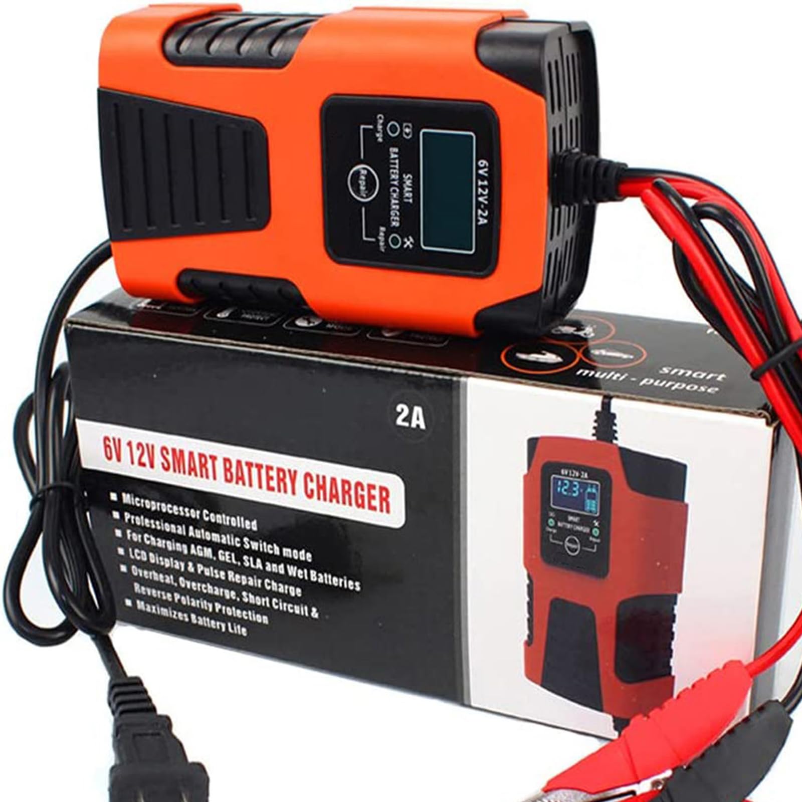 AUTOWHD 6Vと12V用バッテリー充電器 全自動バッテリーチャージャー 修復機能 パルス充電 メンテナンス充電 2A充電 4-40Ah用 自動車&バイク用