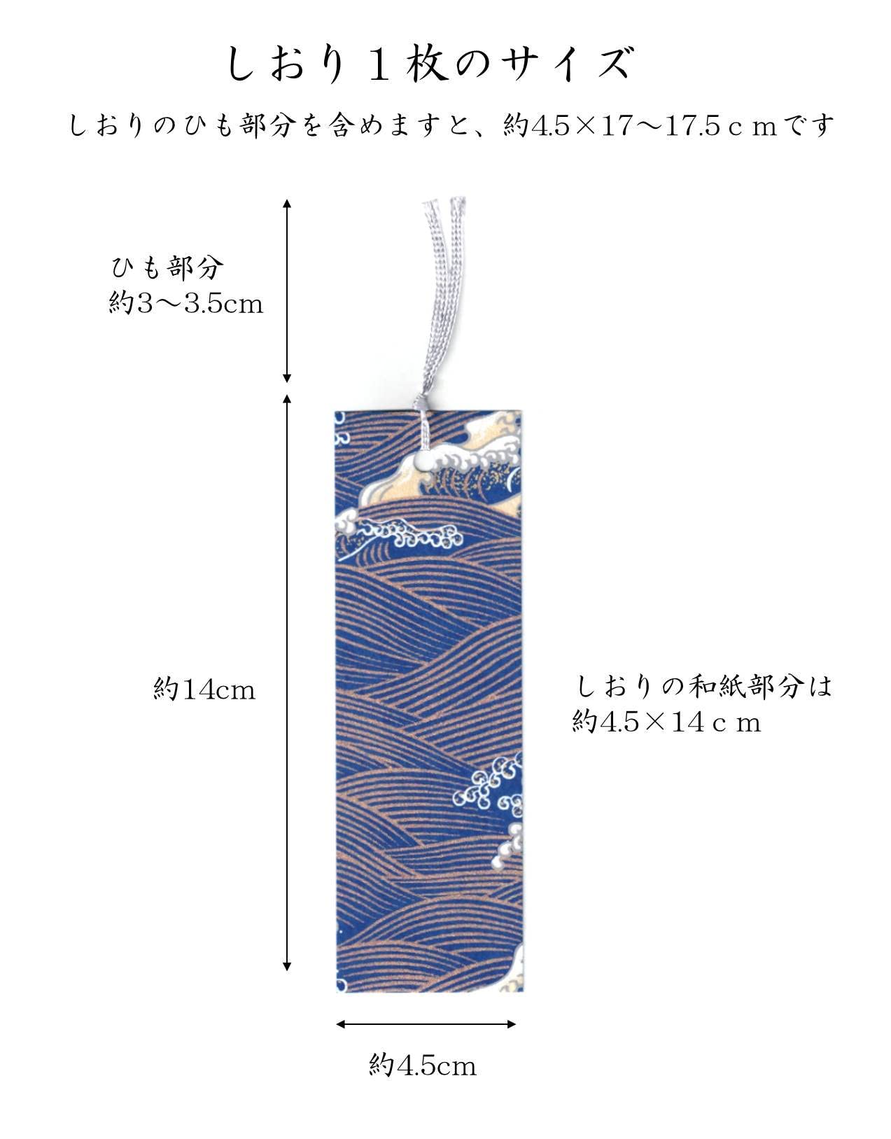 【しおりサイズ】 約4.5×17~17.5cm (和紙部分14cm+ひも部分約3~3.5cm)