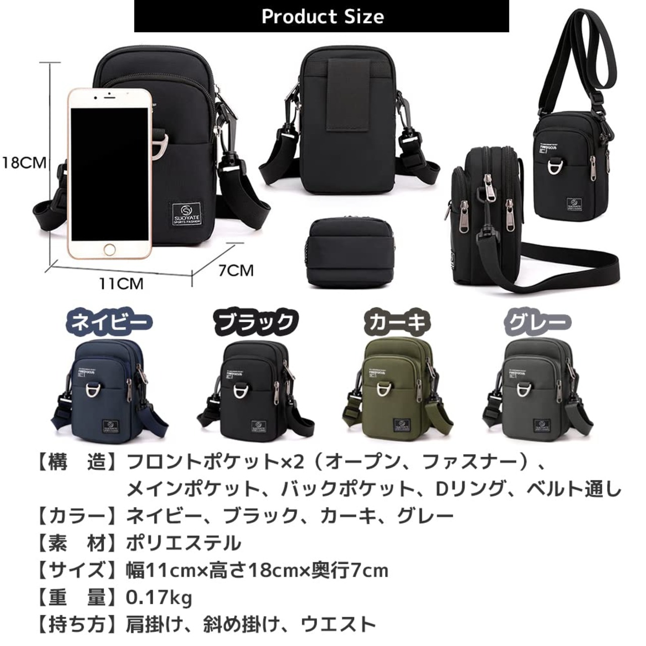 【カラー】ネイビー、ブラック、カーキ、グレー【素材】ポリエステル【サイズ】幅11cm×高さ18cm×奥行7cm【重量】0.17kg【持ち方】肩掛け、斜め掛け、ウエスト