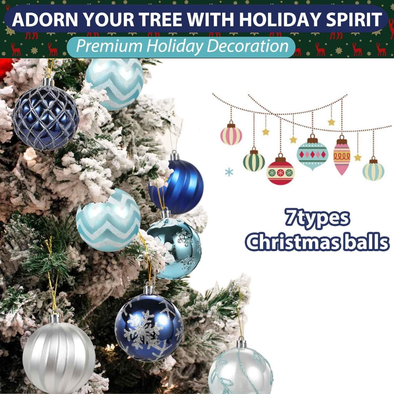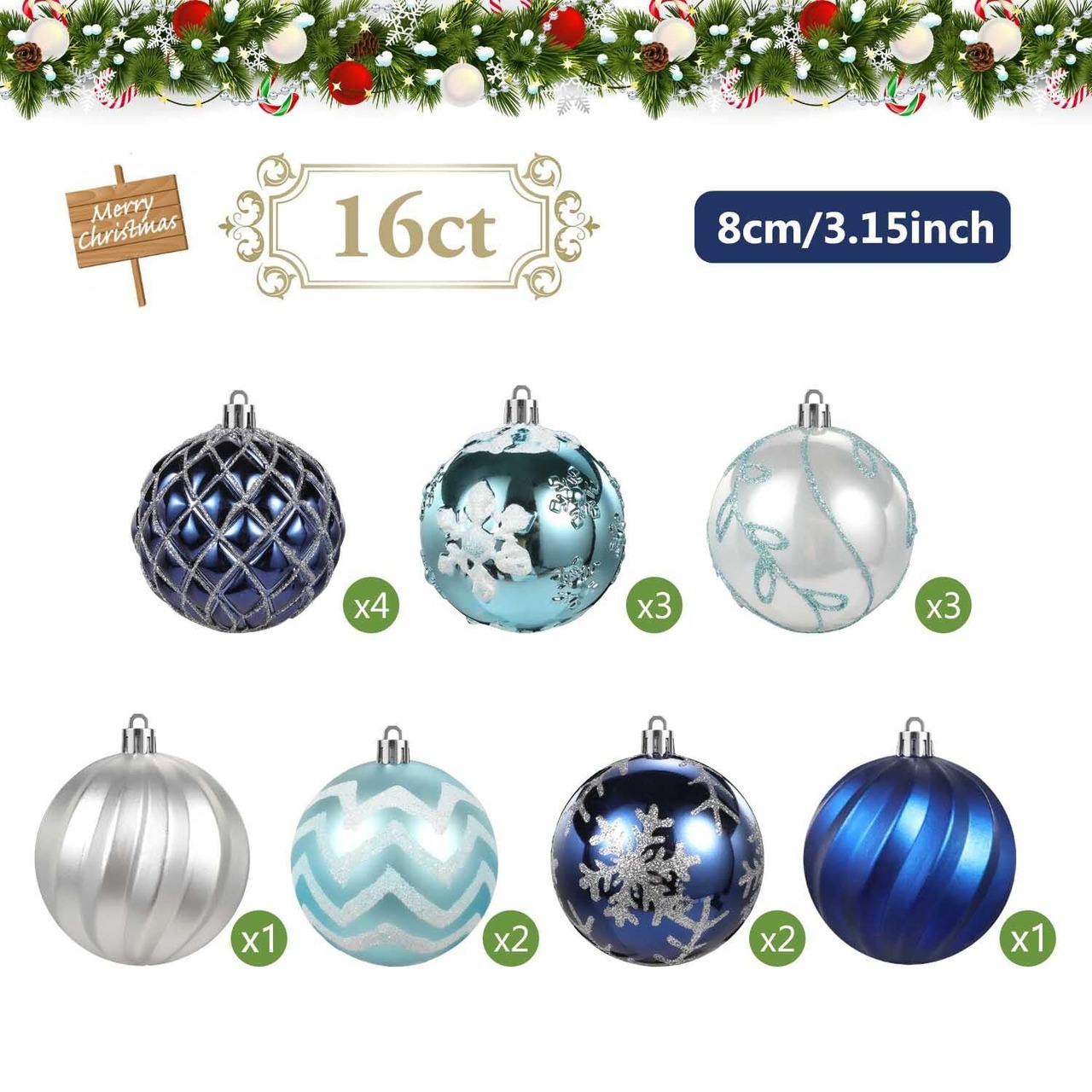 【製品仕様】セット内容:クリスマスオーナメント16pcs入り、サイズ:8㎝ボール、カラー:ブルーとシルバー、材質:プラスチック。