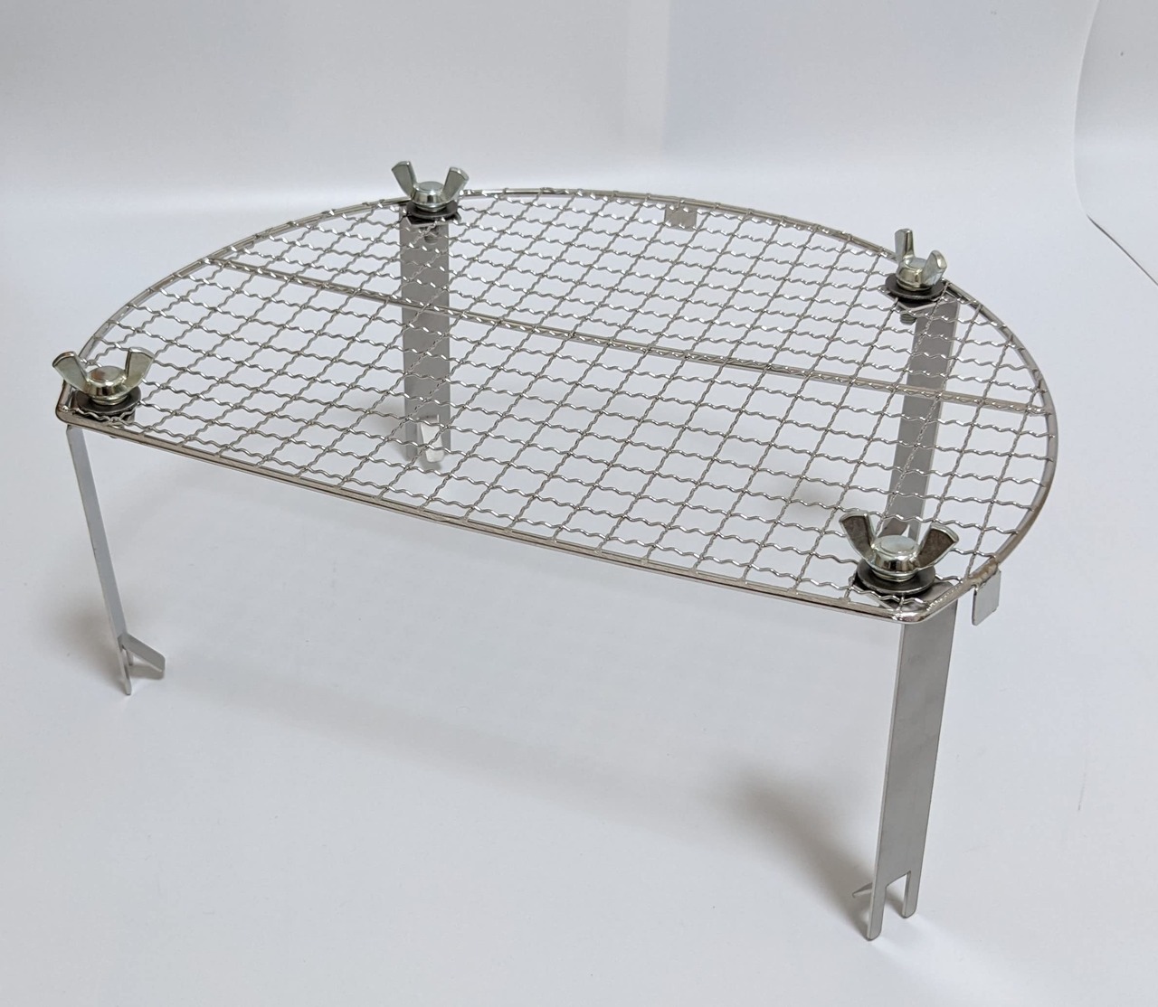 ■人気商品につき在庫が少ない状態です。 気になっている方はお早めの購入をオススメします。 ファイアー嵩上げ金具のロングバージョンとなります。食材がより調理しやすくなりました。 ファイヤーディスク、ソロ(φ300mm、φ450mm)の網に取り付ける専用金具です。 ※焚き火台、網は商品に含まれません※ こちらの商品は『専用金具4個+取付ネジ』です 工具不要で取り付けできる蝶ネジを付属します。 ファイアーディスクの付属の焼き網は本体と焼き網の高さが狭い為、炭の大きさが限られます。その為、炭の継ぎ足し時に焼き網を外す必要が高いです。 網に専用金具を付けることて約100mm程度の高さを出し、網を外すことなく大きな炭や薪の継ぎ足しができるようになります。 ロング足バージョンとなっているので、強火にしても食材が焦げ付きにくく調理しやすくなっています。 材質 ステンレス製 足の高さ 100mm(焚き火のフチから) ファイヤーディスクの専用極厚鉄板も販売しております。当アカウントをご覧ください。 【注意事項】 ・金具は手曲げ加工している為、曲げ角度に多少バラつきがございます。 ・コンロにセットした際にガタ付がある場合は、足の角度を手曲げで調整して下さい。 ・無傷での加工はできません。多少の加工傷はご了承下さい。 ・ネジの取り付けは、網のマス目が比較的小さいところに取り付けてください。ワッシャーよりマス目が大きいと外れてしまいます。 ・網のマス目と外周のフチで段差があり、金具が少し斜めに取り付きますが安定性には問題ないかと思います。