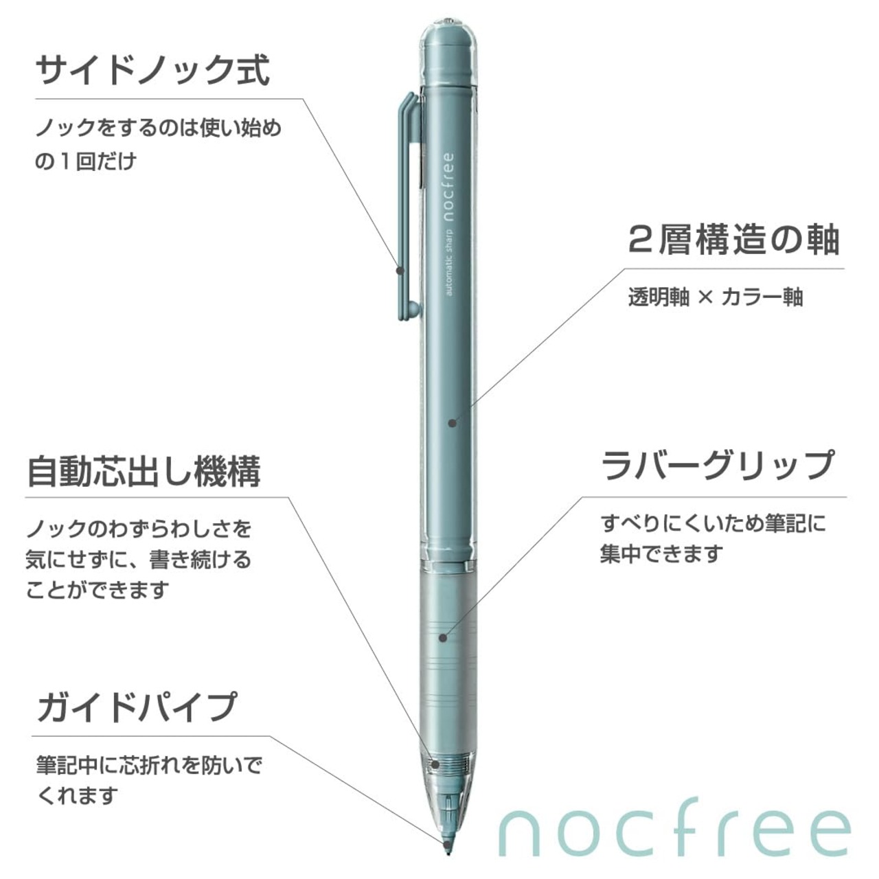 ①サイドノック式でノックをするのは使い始めの一回だけ。 ②透明軸×カラー軸の2層構造の軸がカッコイイ。 ③ラバークリップは滑りにくいため筆記に集中できます。 ④自動芯出し機構でノックの煩わしさを気にせずに、書き続けることができます。 ⑤筆記中に芯折れを防ぐ、ガイドパイプが付いています。
