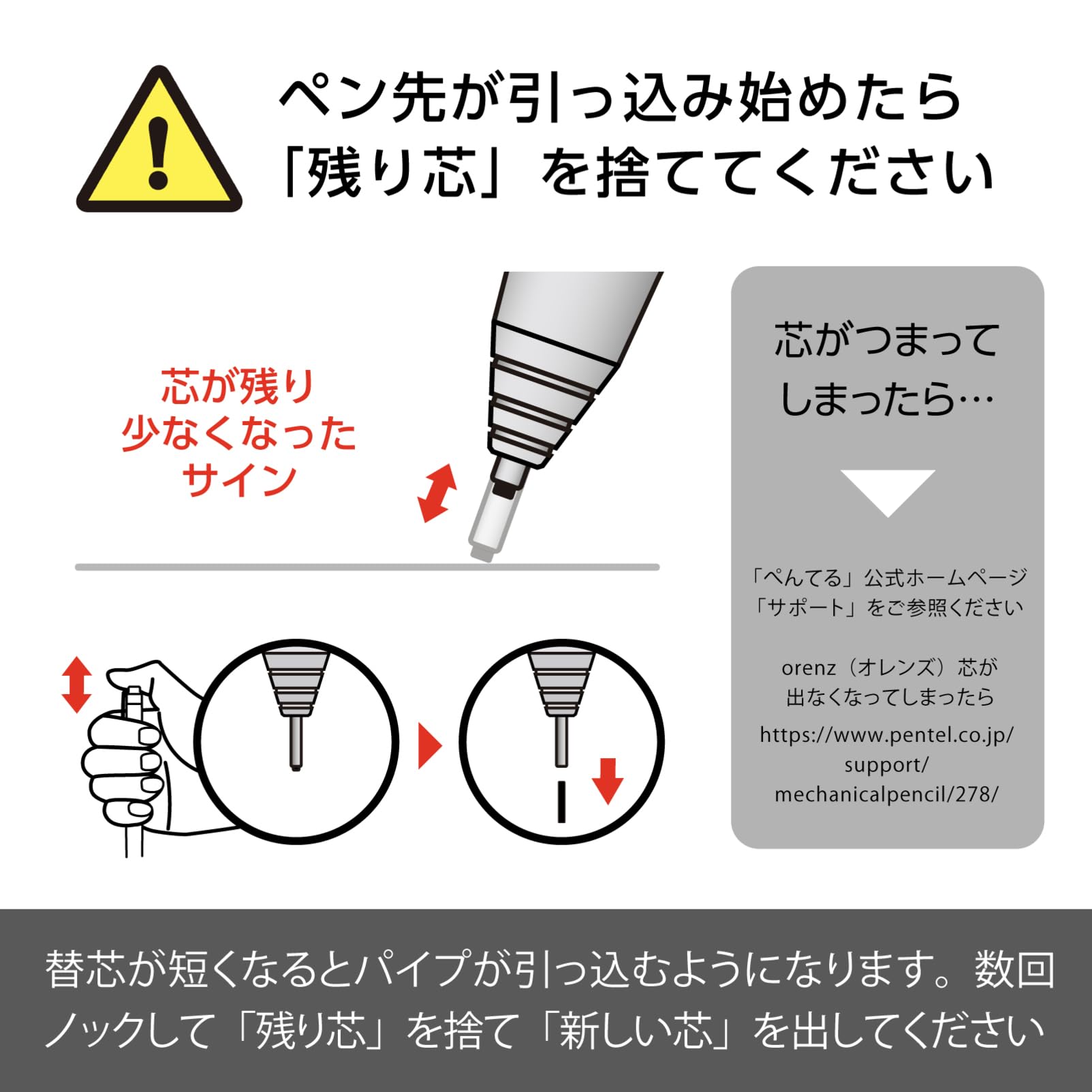 ペン先が芯の減りに合わせてスライドするので、芯を守ったまま書き続けられます。