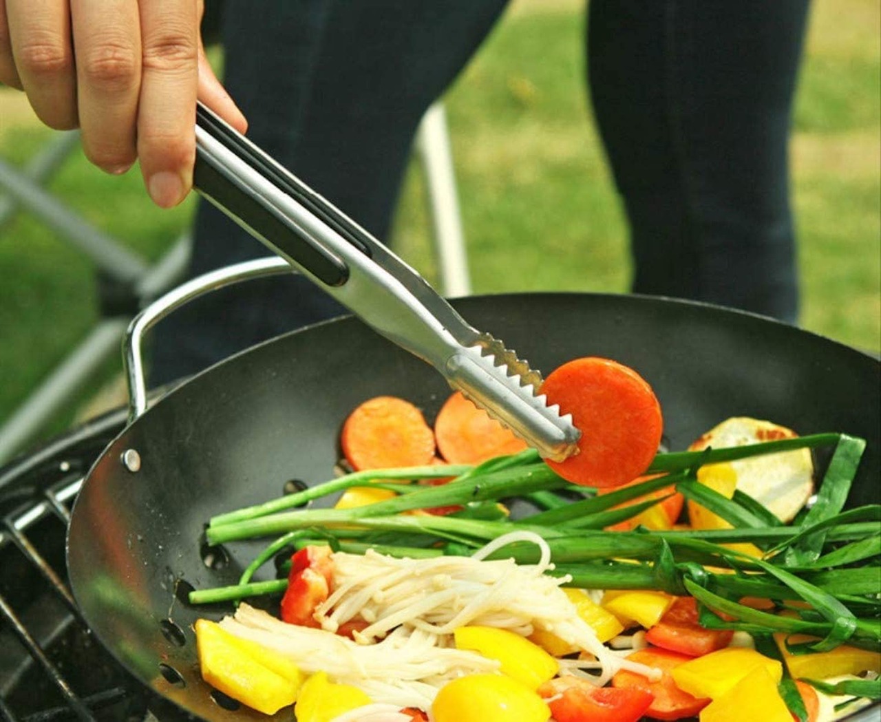 特徴:①ギザ形の先端が肉や野菜 をしっかり掴んでくれる、②樹脂製掴み部分は熱伝導 で熱くなっても安心