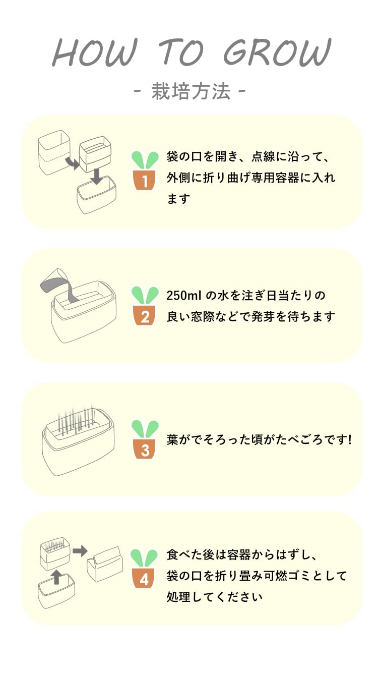 水250mlを注いで日当たりの良い場所に置く。発芽より5~7日が目安です。リフィルは使用後に可燃ごみとして処理できます