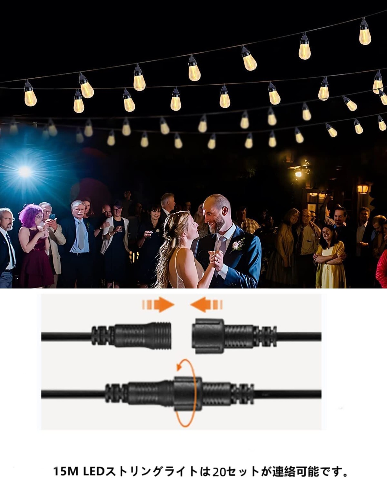 防雨型LEDストリングライト 15M 15個LED電球付き(予備電球2個) 2700K電球色 PC素材 破損しにくい 連結可能 LEDイルミネーションライト屋内/屋外照明 ガーデンライト クリスマス イルミネーション 装飾ライト誕生日パーティー電飾 結婚式飾り