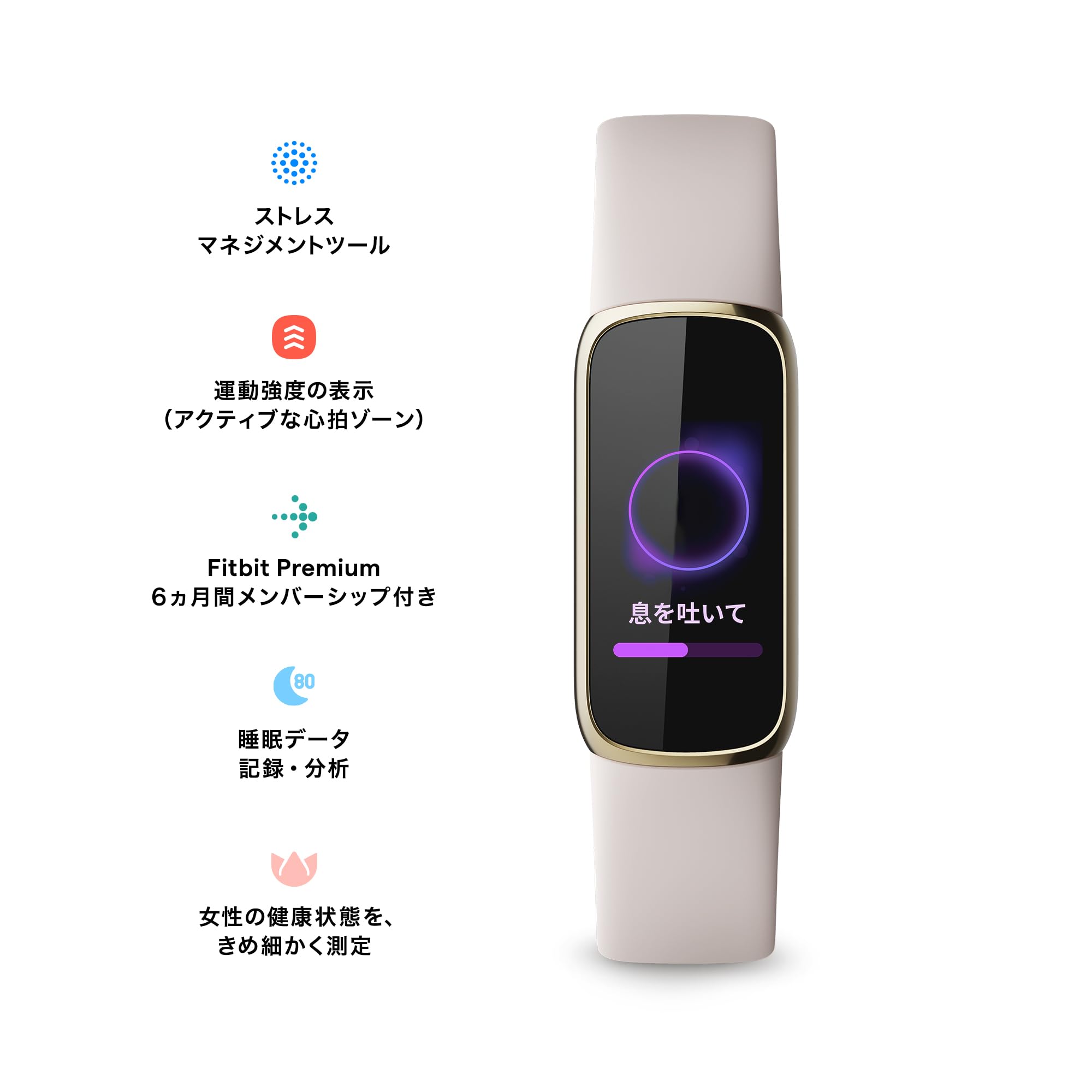 Fitbit Luxe は、ファッショナブルな健康管理トラッカー。心と体の健康に向かうモチベーションを高めてくれます。手首のデバイスでのデータの測定やアプリでの分析機能に、洗練されたブレスレットデザインをプラス。Luxe は毎日の装いに欠かせないアイテムです。睡眠やアクティビティの記録から、心を穏やかにする時間の確保まで、Luxe は健康への旅をサポートします。