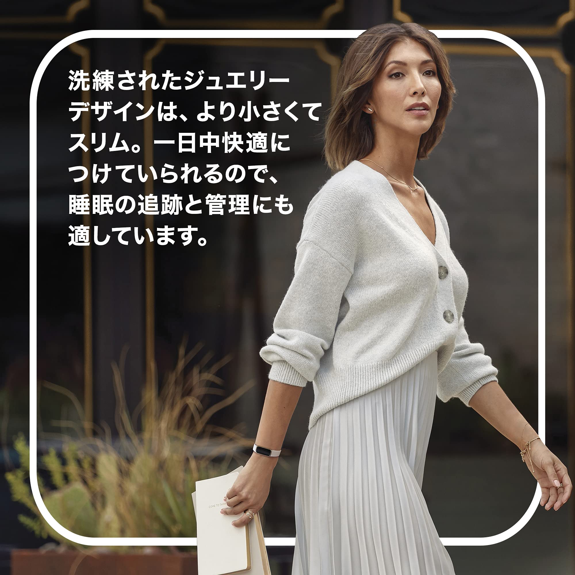 【ジュエリーデザイン】Fitbit Luxe は、どんな服装にも似合うファッショナブルなデザイン。スリムなスタイルで、ステンレススチールのケースや、快適なベルトを備えた Luxe は、毎日の装いに欠かせないアイテムです。